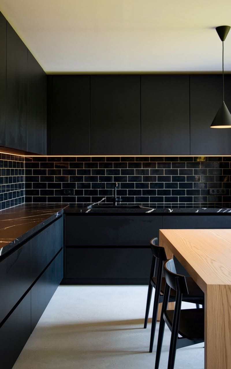 A study in contrasts, this kitchen plunges into dramatic depths with sleek black cabinetry and glossy subway tiles, punctuated by the warm glow of recessed lighting that traces a subtle line above the backsplash. The stark geometry of the room is softened by the natural wood of a dining table, its pale surface a quiet counterpoint to the inky expanse, suggesting a space designed for both culinary artistry and intimate gatherings.