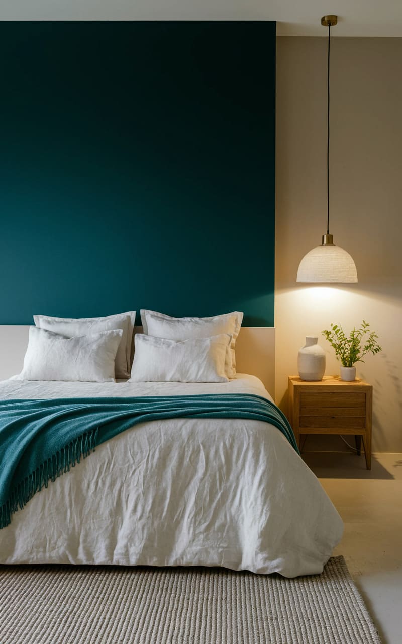 172. Minimalist Bedroom with Deep Teal and Soft Linen Accents