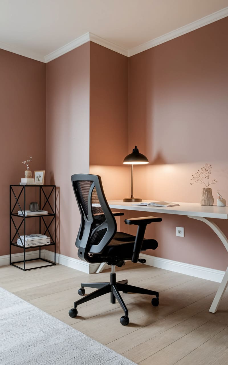 A quiet corner whispers of productivity, where a sleek, ergonomic chair stands sentinel before a minimalist desk, its curved form echoing the soft glow of a nearby lamp. The room’s muted palette, a blend of warm blush and crisp white, creates a sense of calm focus, while a geometric shelf unit adds a touch of industrial edge. The space feels thoughtfully curated, a serene haven designed for contemplation and creation, where every element serves a purpose without uttering a sound.