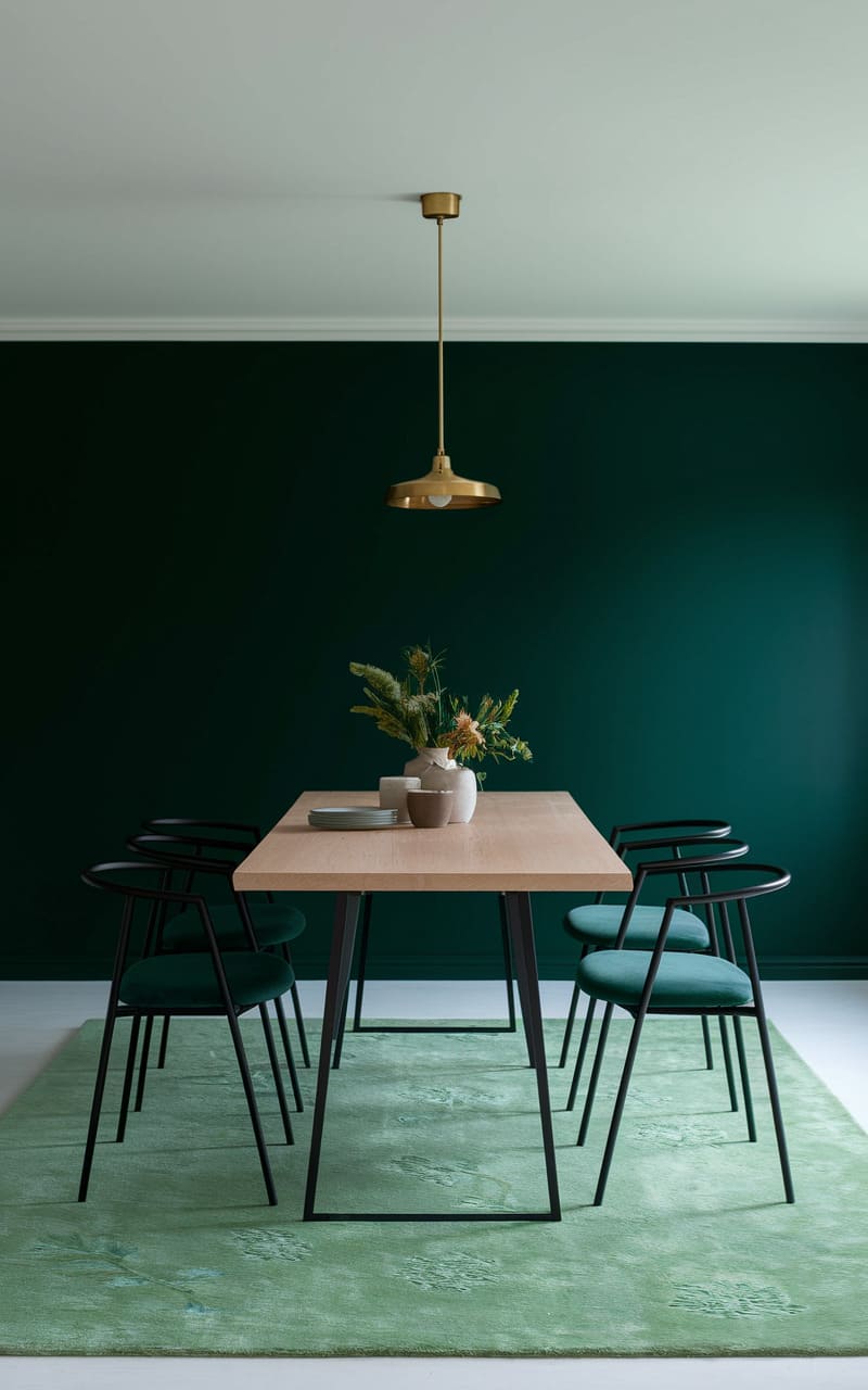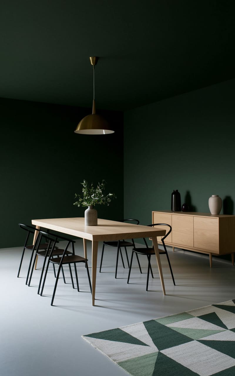 A deep, forest-green envelops this space, creating a hushed and dramatic backdrop for a simple gathering. A light wood table anchors the room, its warmth echoed by a sideboard, while black chairs add a stark, modern edge. A brass pendant lamp casts a focused glow, highlighting the organic sprigs in a vase and the geometric patterns of a rug, hinting at a quiet sophistication within this richly colored sanctuary.
