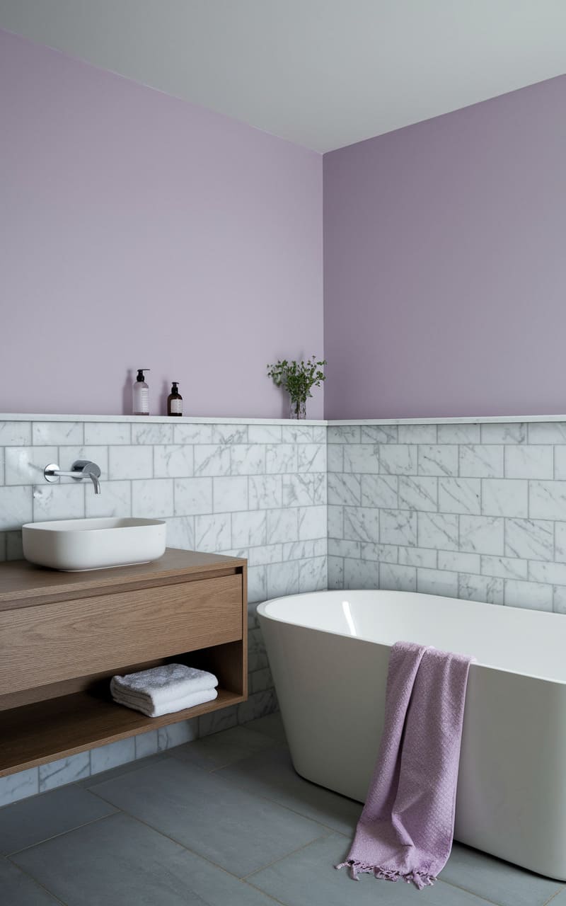 A whisper of lavender graces the walls of this serene space, a soft counterpoint to the cool, marbled tiles lining the lower half. The clean lines of the modern sink and the inviting curve of the freestanding tub suggest a sanctuary of quiet indulgence. A simple wooden vanity, holding a neatly folded towel, anchors the room, while a small posy adds a touch of organic softness to the crisp geometry, creating a haven of understated elegance.