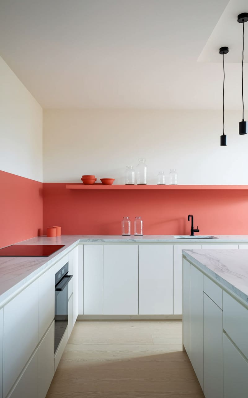 A crisp, clean geometry defines this kitchen space, where stark white cabinetry meets a bold swathe of coral, adding a jolt of unexpected warmth. The minimalist aesthetic is amplified by the sleek, handleless cupboards and the slender, black pendant lights that hang like punctuation marks above the central island. A single, narrow shelf displays a curated collection of glassware and bowls, their simplicity echoing the room’s overall sense of uncluttered purpose, a space designed for both function and a touch of playful sophistication.