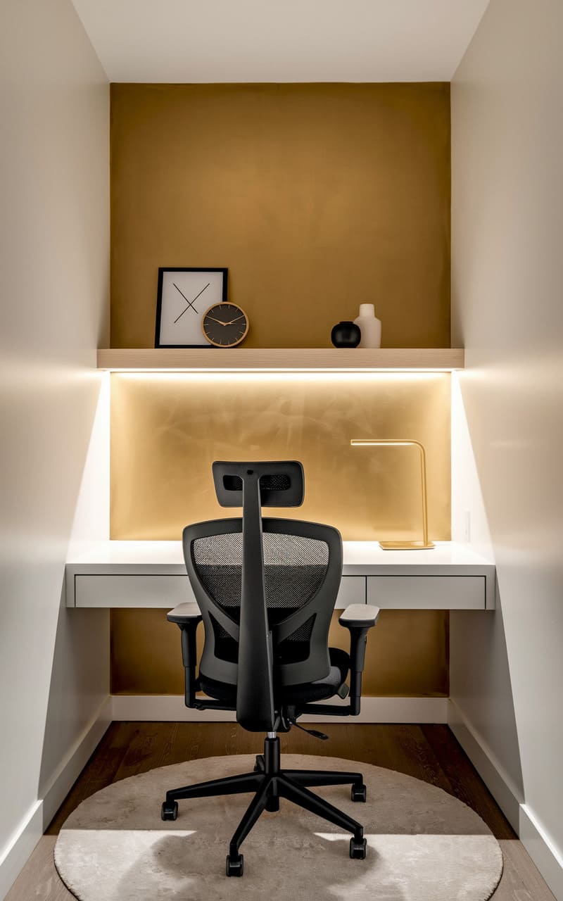 A pocket of focus, this workspace tucks neatly into a narrow alcove, where a sleek ergonomic chair faces a clean, white desk. Warm illumination emanates from a hidden source, highlighting the textured gold backdrop and the simple objects resting on a slender shelf. The space whispers of productivity, a personal sanctuary designed for quiet concentration and thoughtful creation.