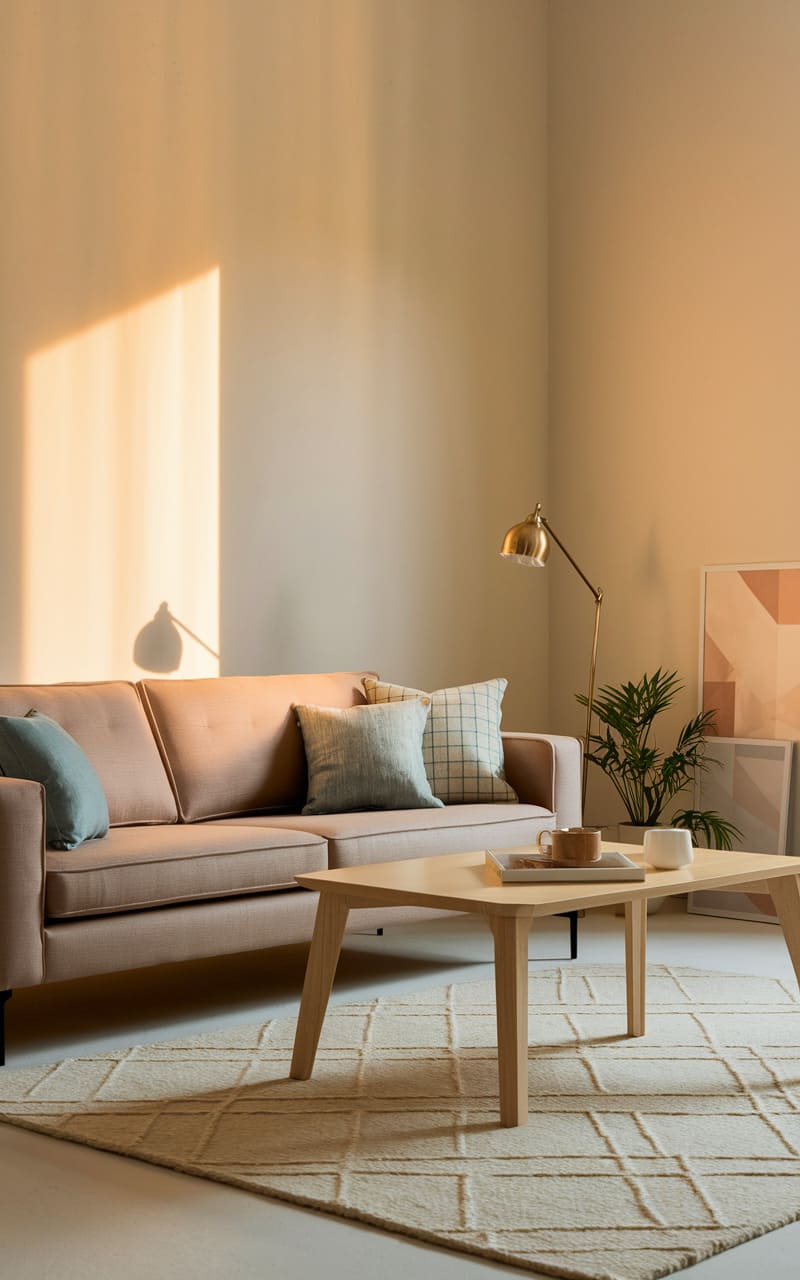 A wash of warmth gently paints the corner of this serene space, highlighting the soft blush of a modern sofa and the clean lines of a geometric rug beneath a low, inviting coffee table. The room feels effortlessly composed, a quiet conversation between the muted tones of the walls and the subtle gleam of a brass floor lamp that stretches gracefully towards a framed print leaning casually against the wall. A small potted plant adds a whisper of life to the corner, grounding the space with a touch of organic tranquility.