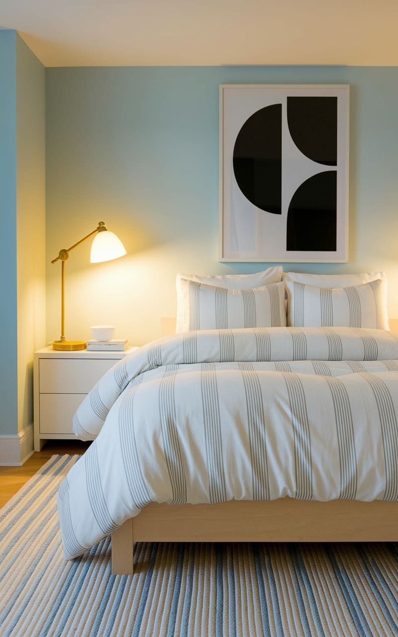 182. Minimalist Bedroom with Light Blue and Striped Accents