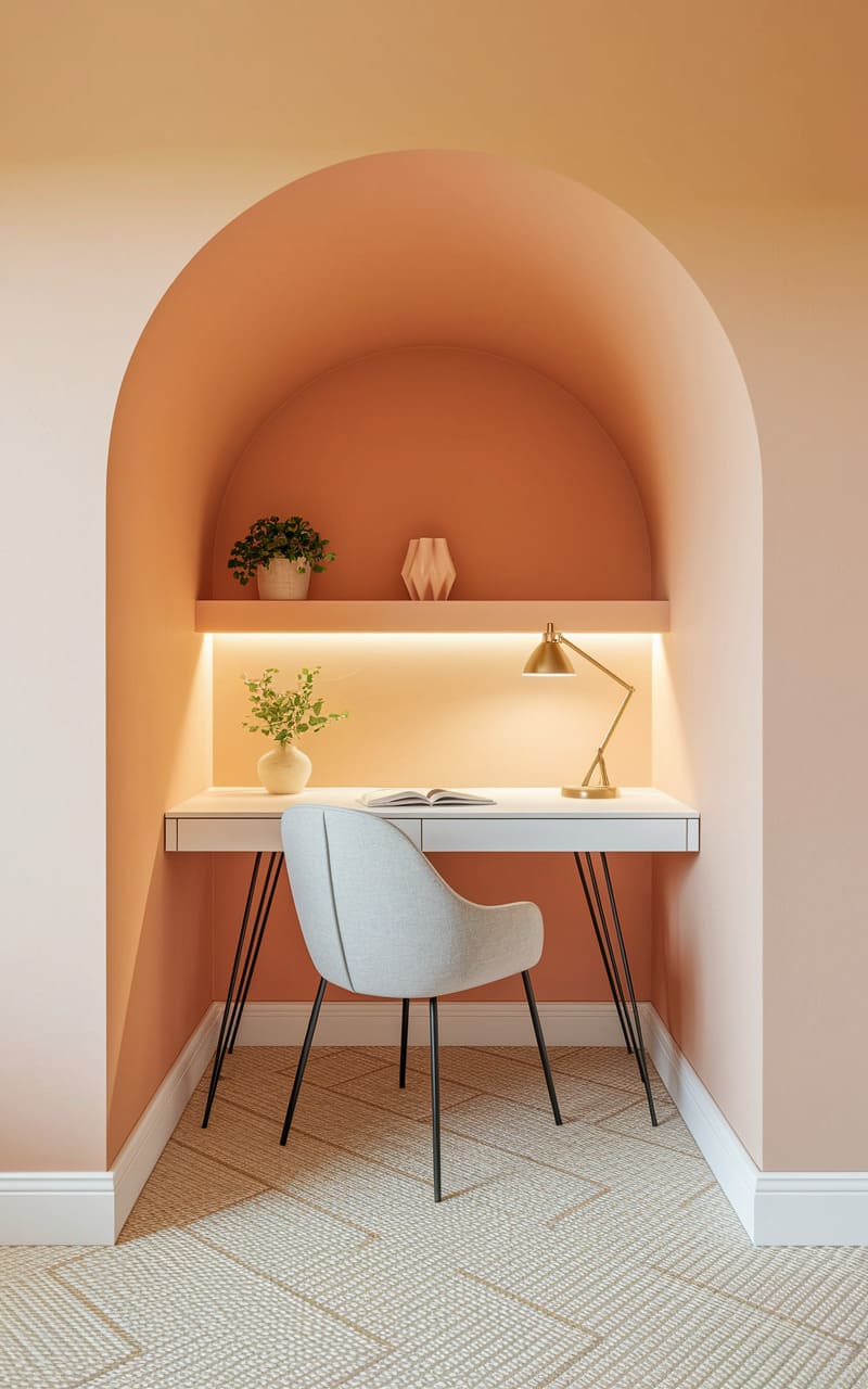 A warm, peachy alcove cradles a simple workspace, where a slim desk and modern chair await, illuminated by the soft glow of a hidden light. The arched niche creates a sense of intimate focus, while the minimal decor – a few delicate plants and a sculpted vase – adds a touch of organic serenity. This space feels like a quiet invitation to contemplation, a pocket of calm carved into the everyday.