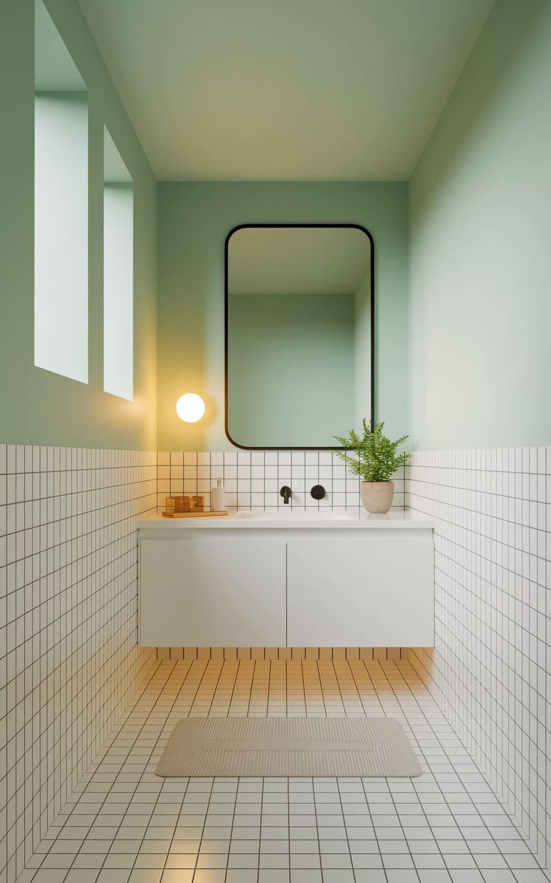 A breath of fresh mint fills this compact space, where a grid of clean white tiles meets walls painted in a calming, verdant hue. A floating vanity, simple and sleek, anchors the room, its soft glow emanating from beneath, while a rounded mirror reflects the understated elegance. A small plant adds a touch of organic life, softening the geometric lines and hinting at a refreshing, spa-like escape.
