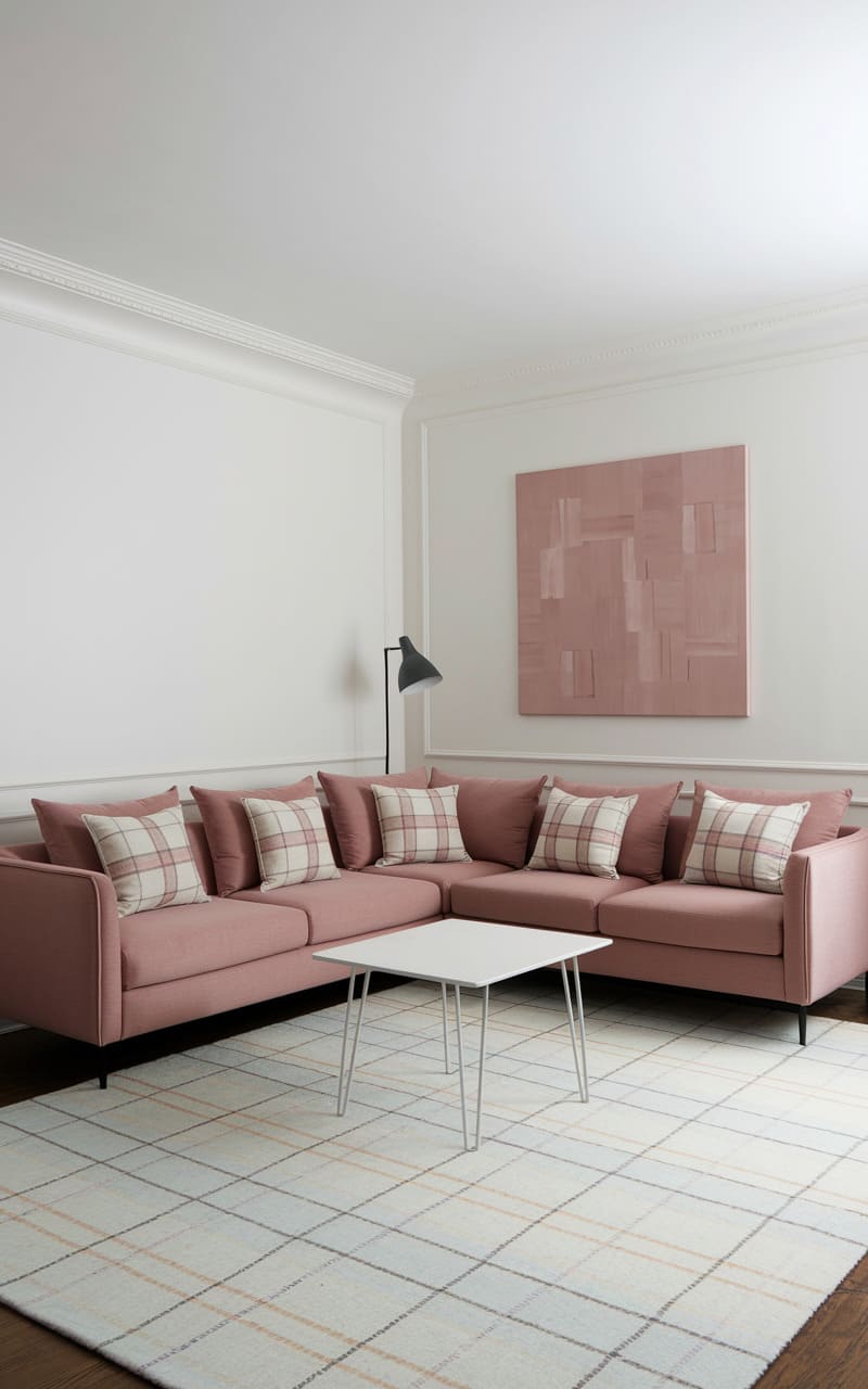 187. Minimalist Living Room with Dusty Rose and Subtle Plaid Patterns