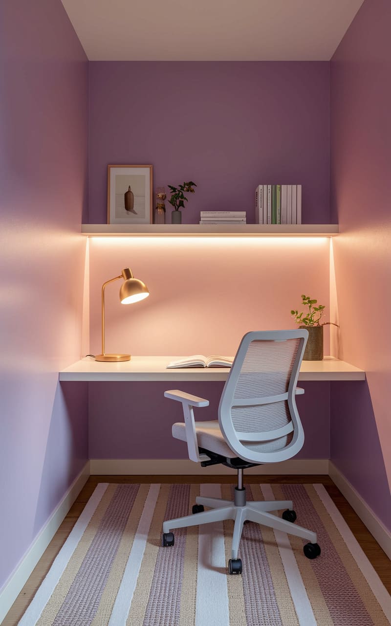 A pocket of lavender calm, this tiny workspace tucks neatly into a corner, its soft, pastel walls embracing a simple desk and a chair that promises comfort. A warm glow emanates from a hidden strip of light, highlighting a curated shelf and a small lamp, each piece chosen with intention. The striped rug adds a subtle pattern underfoot, anchoring the space, a quiet haven for focused thought and gentle creativity.