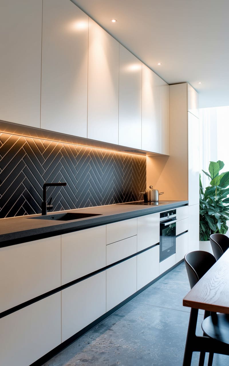 The kitchen hums with a sleek, contemporary energy, a study in contrasts: smooth, pale cabinetry against a striking herringbone backsplash in deep charcoal, the linear flow punctuated by the dark geometry of a faucet and countertop. Recessed lighting casts a soft glow, highlighting the clean lines and understated elegance, while a glimpse of verdant foliage in the periphery hints at a connection to nature, tempering the room’s urban sophistication. It’s a space designed for both function and quiet contemplation, where form and texture coalesce in a harmonious, modern tableau.