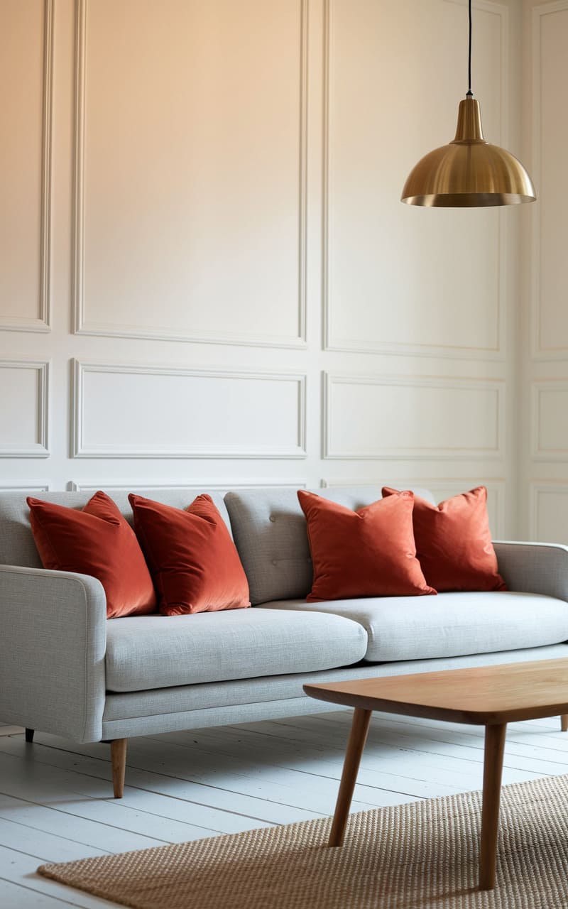 A hushed elegance permeates the room, where a dove-gray sofa anchors the space, its plush cushions a stark contrast to the crisp, paneled walls. Four rust-colored pillows punctuate the scene, their velvety texture drawing the eye, while a brass pendant lamp hangs like a poised note, casting a gentle ambiance. The simple, wooden coffee table, paired with a textured rug, completes the composition, creating a space that feels both curated and inviting, a quiet haven of refined comfort.