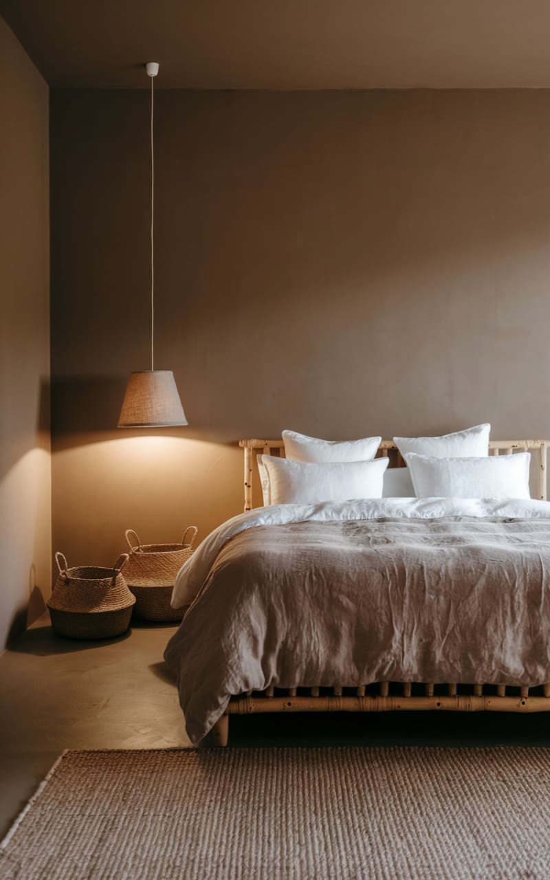 The room emanates a quiet, earthy charm, where walls painted in a rich, warm hue embrace a low-slung, bamboo-framed bed adorned with soft, inviting linens. A simple pendant lamp, suspended by a delicate thread, casts a gentle pool of light, highlighting the natural textures of the woven baskets nestled on the floor and the textured rug that anchors the space. It’s a study in understated comfort, a retreat designed for peaceful repose.