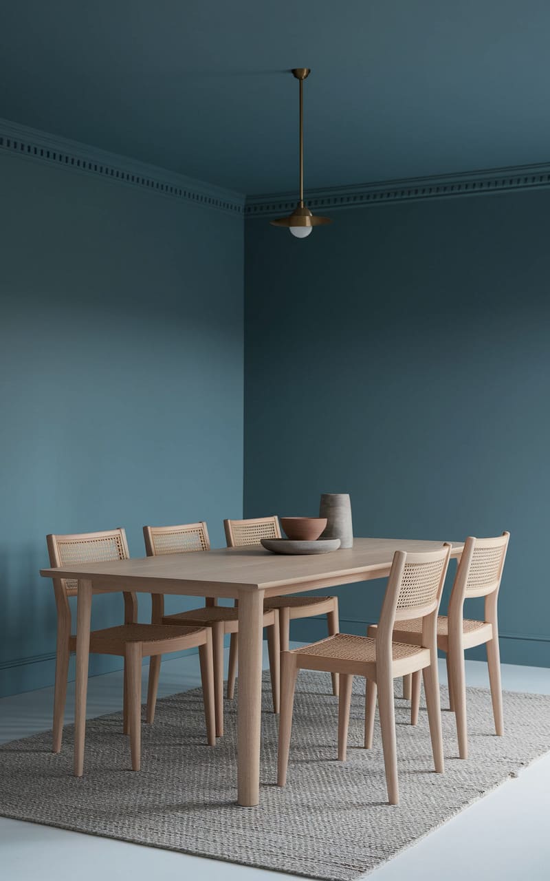 A wash of deep teal envelops this dining space, where the warmth of blonde wood furniture stands in quiet contrast. The table, a simple plane, anchors the room, surrounded by chairs with woven backs that hint at a gentle, tactile comfort. A single, understated pendant hangs above, casting a soft glow that highlights the room’s serene, almost meditative simplicity.