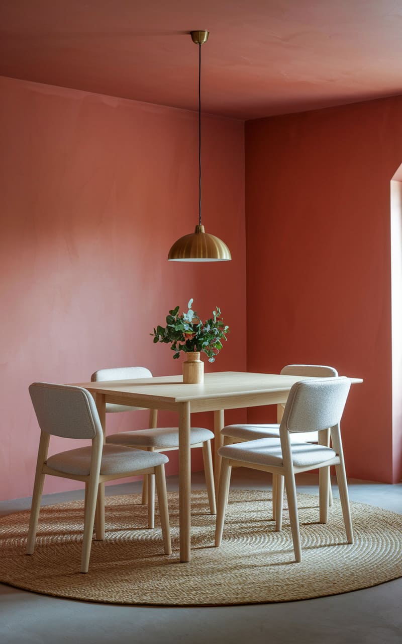 A whisper of terracotta hugs this intimate space, where a simple wooden table and quartet of soft-seated chairs gather on a woven disc. A brass pendant, poised like a warm halo, casts a gentle glow, illuminating a sprig of greenery at the table’s heart. The room feels like a secret, a quiet refuge imbued with a subtle, earthy palette and an unspoken invitation to slow down.