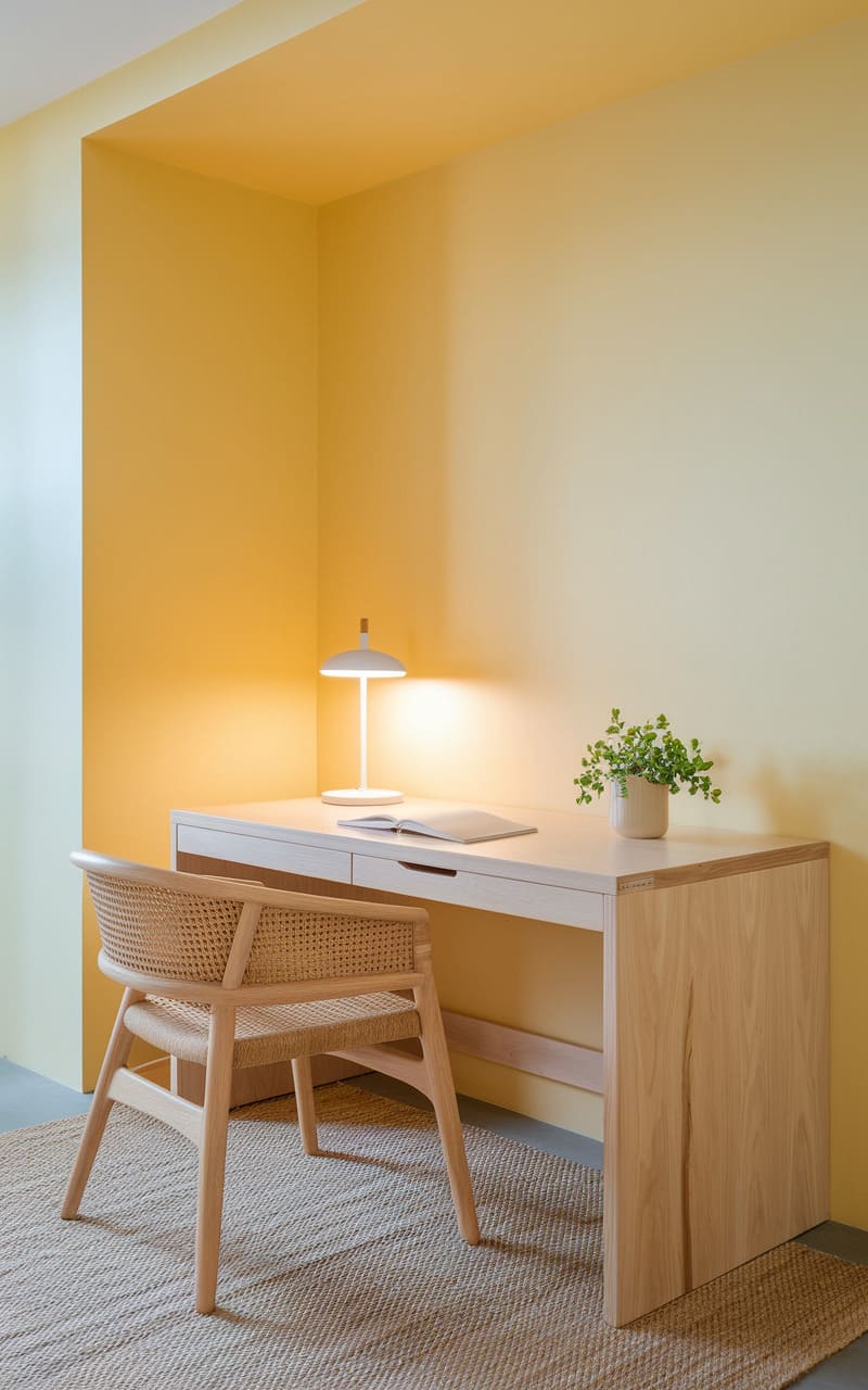 200. Minimalist Home Office with Pale Yellow and Natural Fiber Textures