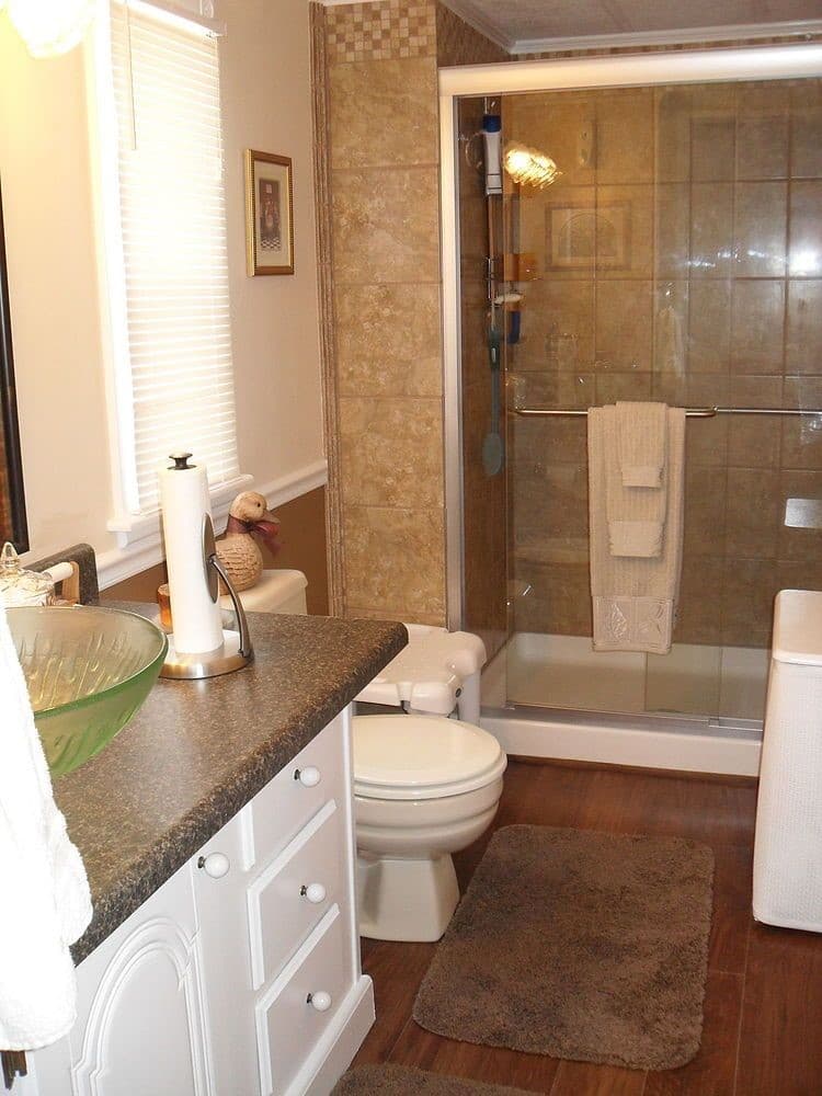 Many mobile home bathrooms are quite small, but this doesn’t mean you cannot make them stylish and comfortable. Fortunately, there is plenty of small-sized off-the-shelf furniture nowadays, so keeping it simple might be exactly what you need if you are on a tight budget. The fashionable green bowl adds simplicity with a modern touch that you simply cannot miss!