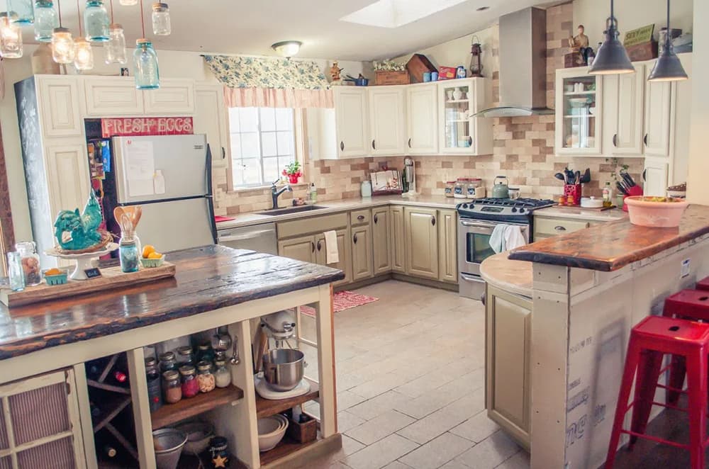 If you love vintage or retro, this image might be exactly the inspiration needed to push you to achieve your dreams. Be bold! Use old kitchen items to decorate the walls, be creative with your produce storage baskets, and perhaps even add an antique radio or telephone. You can notice from afar that this place is like no other – simply oozing personality! These old items can also be quite budget-friendly, especially if you check your parents’ or grandparents’ attics or storage rooms.