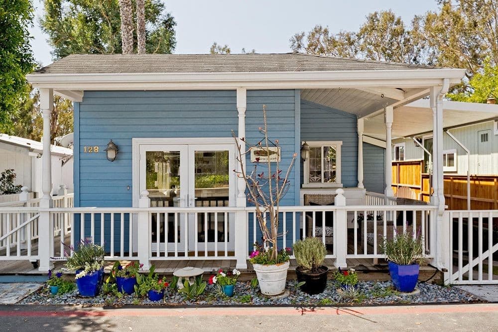 The best asset you gain when you get a mobile home is that you can turn it into whatever you like! If you want to modernize the outside of your mobile home, this design has all the oomph you need. The baby blue walls, double door, and multiple colorful plants with dark blue pots go so well together that you automatically create an exotic, relaxing vibe that you only get on holiday!