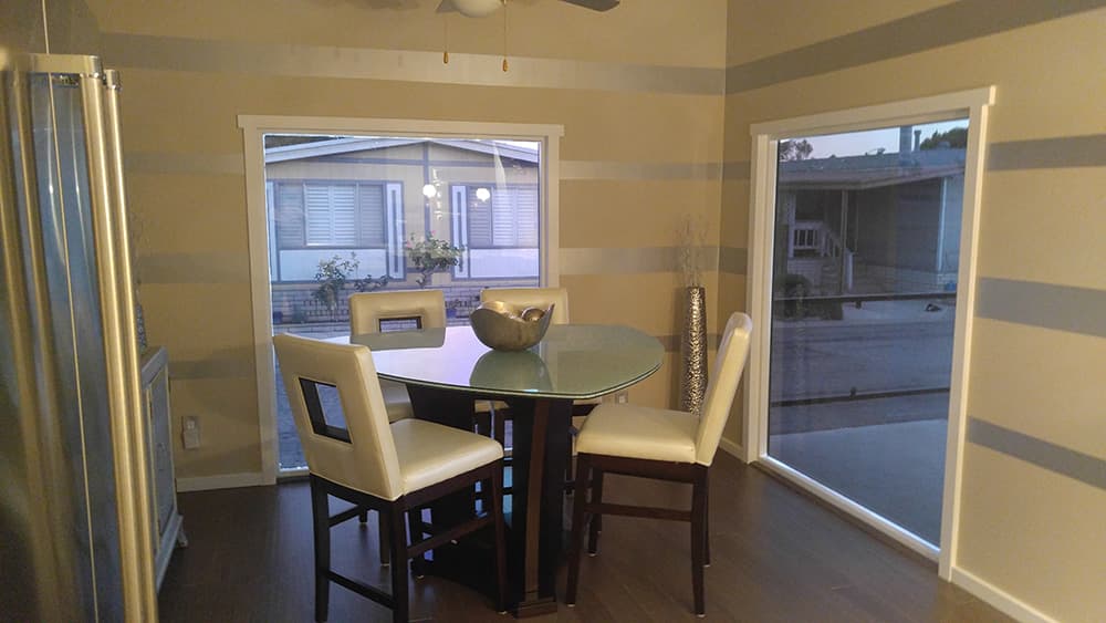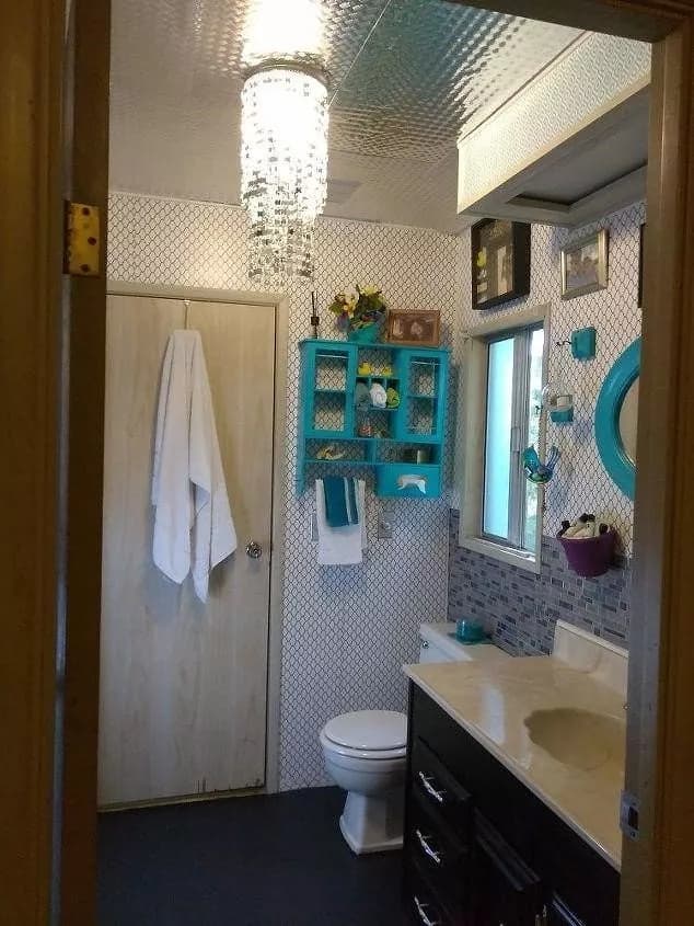 If you want to simply upgrade your mobile home a bit, follow this lead! The owner simply installed this beautiful crystal chandelier, and the entire vibe changed! If you want a new centerpiece, such a bold choice is quite a good idea. Make sure you keep everything else simple in order to allow the lighting to shine! The cream sink and dark floor perfectly match the light blue walls without stealing the attention away from the chandelier.
