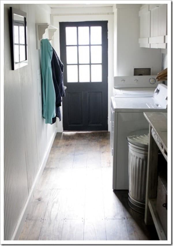Many mobile homes may have this type of space – long and narrow. Although, initially, it seems quite difficult to work with it, there are plenty of options. Of course, all small places look better in light, linen-like colors. This owner added a bit of variety when they chose a black door. The galvanized can as a laundry basket is pure creativity – this is how to turn a dull, long, and narrow room into a stylish laundry area!
