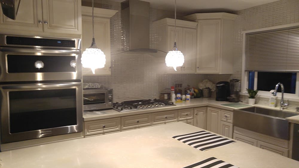 This remodeling boasts freshness and plenty of functionality. The centerpiece is the clearly renovated island with a dark countertop for plenty of space. You can enjoy all of your meals with your family in comfort while absorbing plenty of sunshine from the large windows. All cabinets have numerous storage compartments, so the small kitchen does not stop you from having all the cooking items you need. The contrast between white and black adds a modern, welcoming touch. The lighting is the ultimate décor element that upgrades this kitchen to a whole new level!