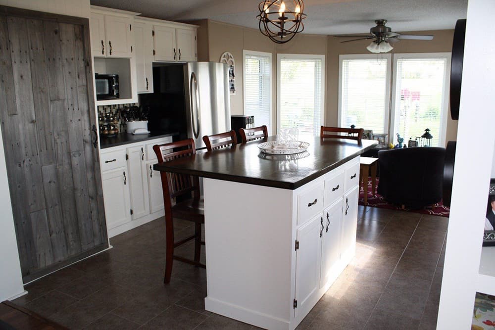 Although you cannot modify walls in your mobile home, creativity knows no boundaries. This owner decided to enclose the tiny kitchen with counters. Once again, the lighter color nuances are suitable for such a small home, while the darker floor and chairs add the much-needed balance. The wall pattern adds just the right amount of detail to make this kitchen stand out from the crowd.