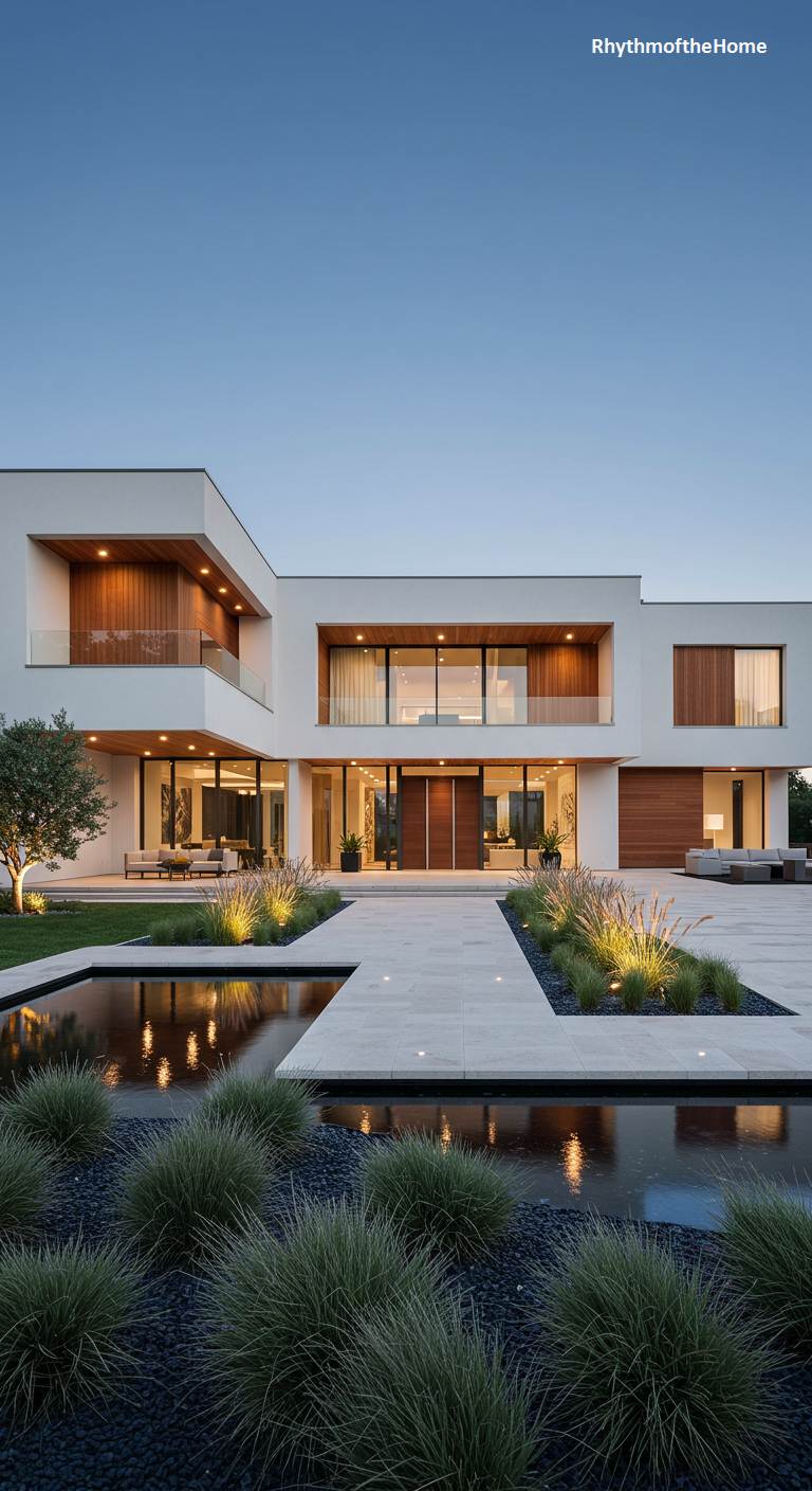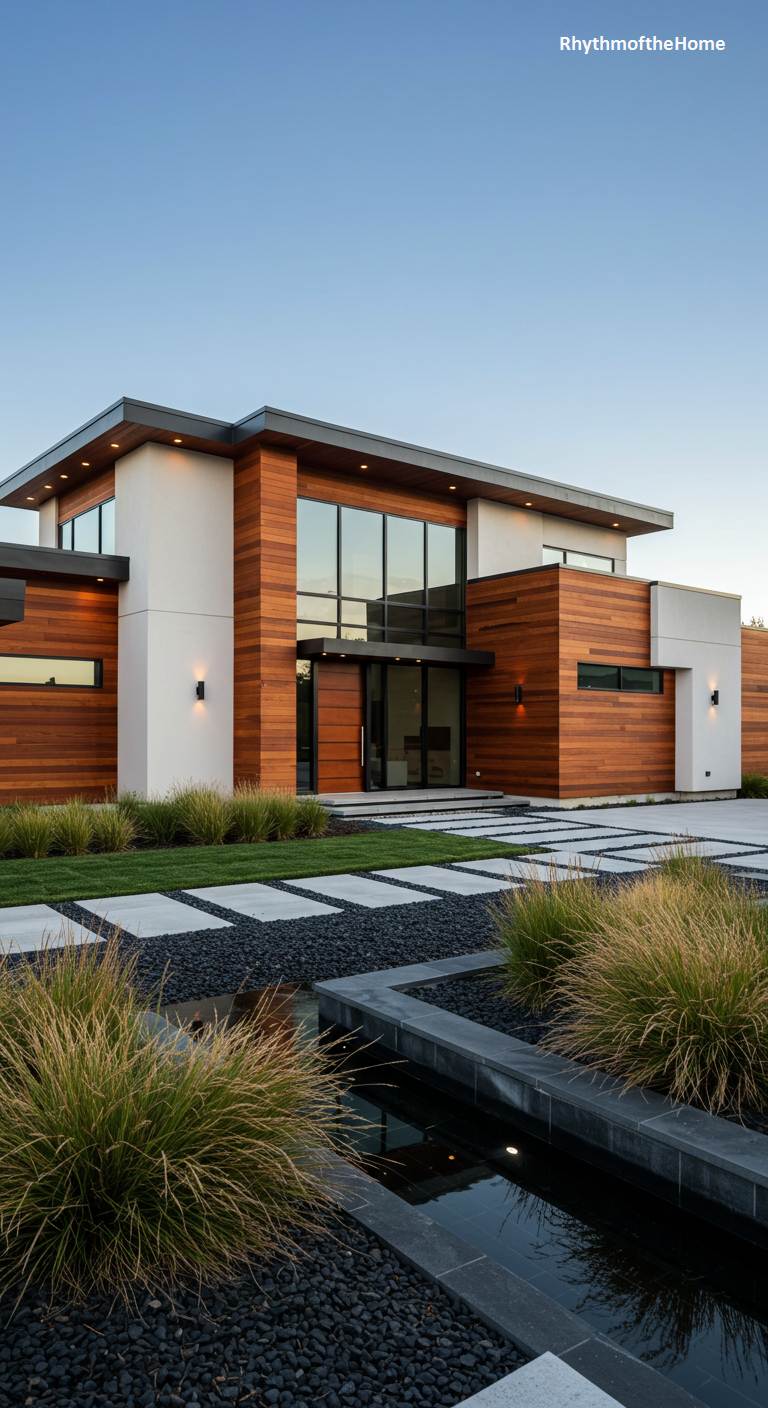 This residence is a masterclass in clean lines and warm minimalism. Its facade, a striking interplay of crisp white stucco and rich, horizontally-laid wood, creates a visual harmony under a clear twilight sky. Expansive windows blur the line between the sleek interior and the meticulously manicured exterior. The approach is a geometric dance of large concrete pavers set amidst dark river stones, leading the eye past sculptural grasses and a tranquil water feature. The home doesn’t just sit on the land; it communes with it, offering a sense of calm, structured elegance that feels both sophisticated and welcoming.