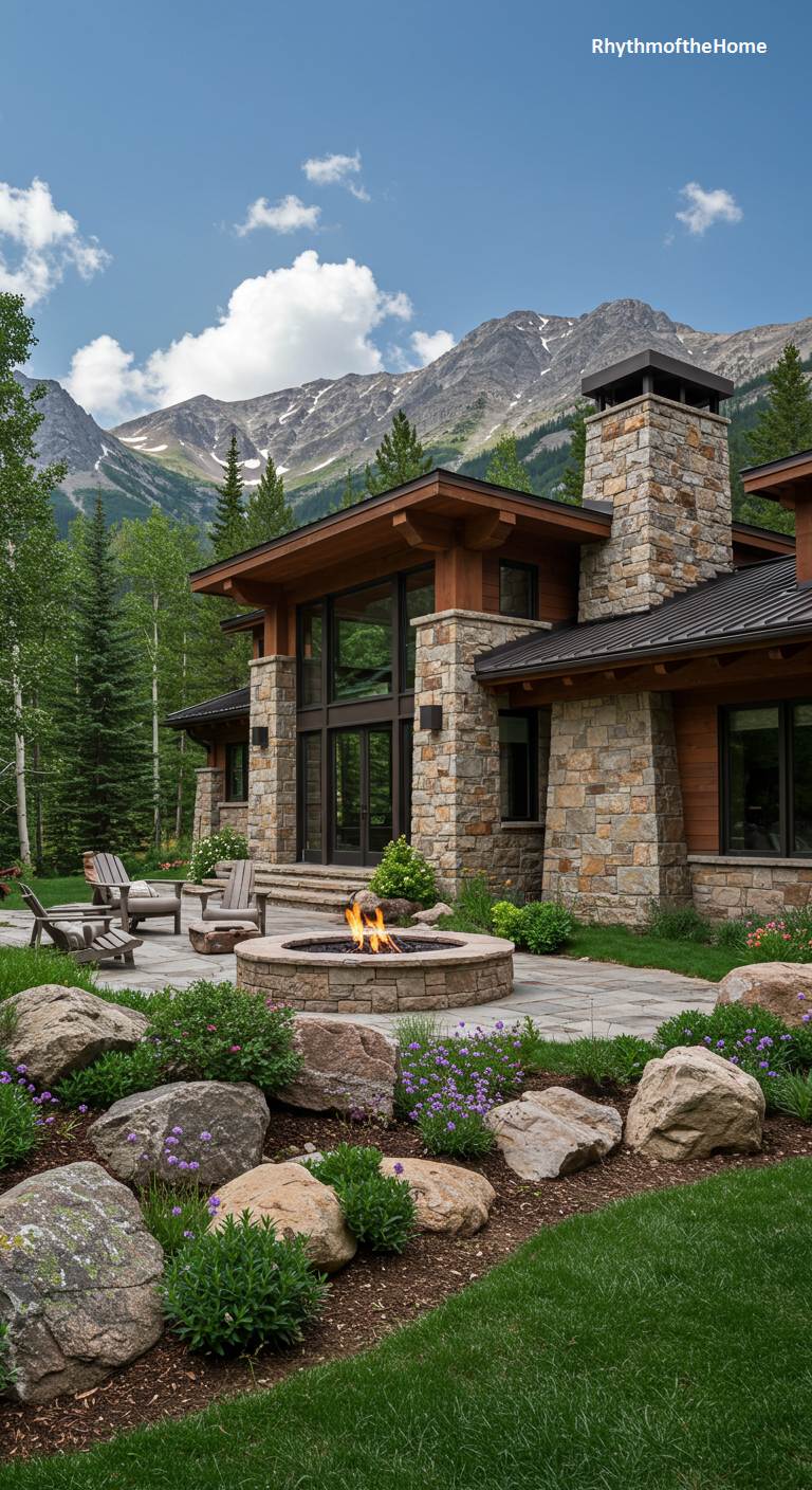 Nestled amidst towering aspens with a breathtaking view of rugged, snow-dusted peaks, this modern home is a testament to mountain architecture. The design harmonizes with its majestic setting through a robust palette of natural stone, warm timber, and dark metal. Substantial stone pillars and a commanding chimney anchor the structure, conveying a sense of permanence and strength against the wild landscape. An inviting stone patio, complete with a roaring fire pit and comfortable Adirondack chairs, extends the living space directly into nature, creating the perfect alpine retreat for both adventure and serene contemplation.