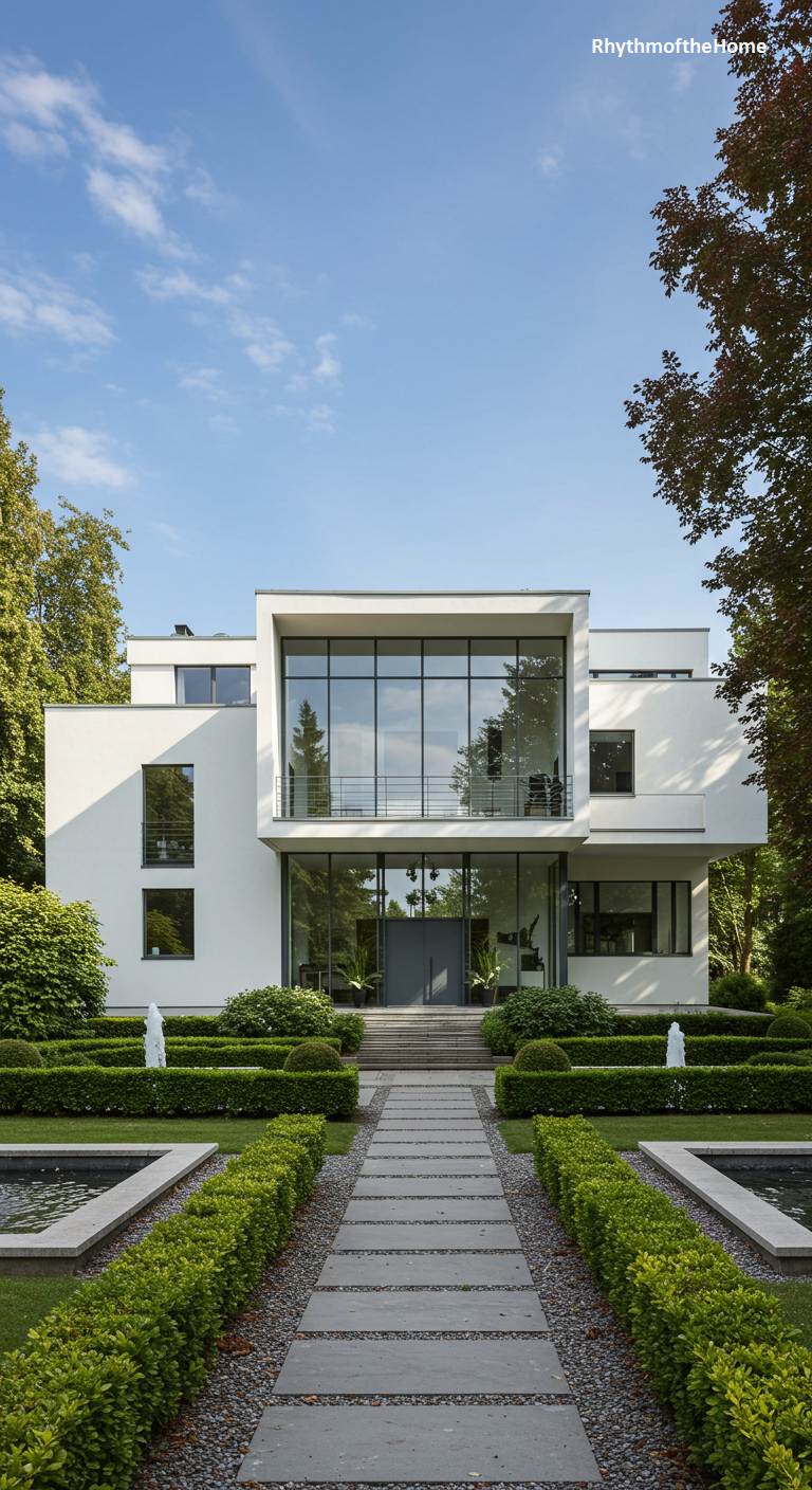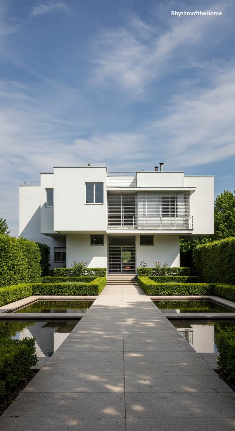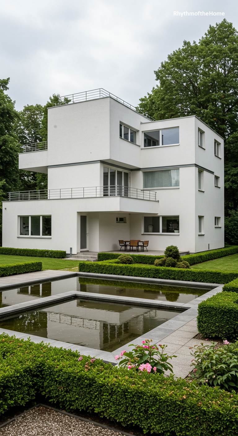 This home is a masterful study in early modernist principles, evoking the pure, functional aesthetic of the International Style. The building is a dynamic assembly of interlocking white, cubic volumes, with asymmetrical balconies and ribbon windows that emphasize horizontality. Simple pipe railings and flat roofs maintain the unadorned, form-follows-function ethos. The surrounding garden echoes this geometric rigor, featuring a square reflecting pool neatly framed by trimmed boxwood hedges. The composition of house and landscape feels deliberate and intellectual, a timeless tribute to the pioneers of modern architecture and their revolutionary vision.