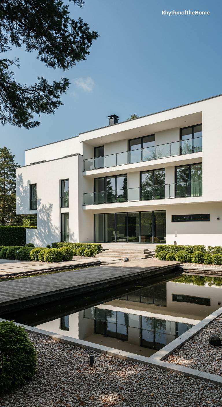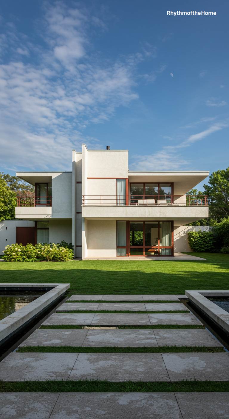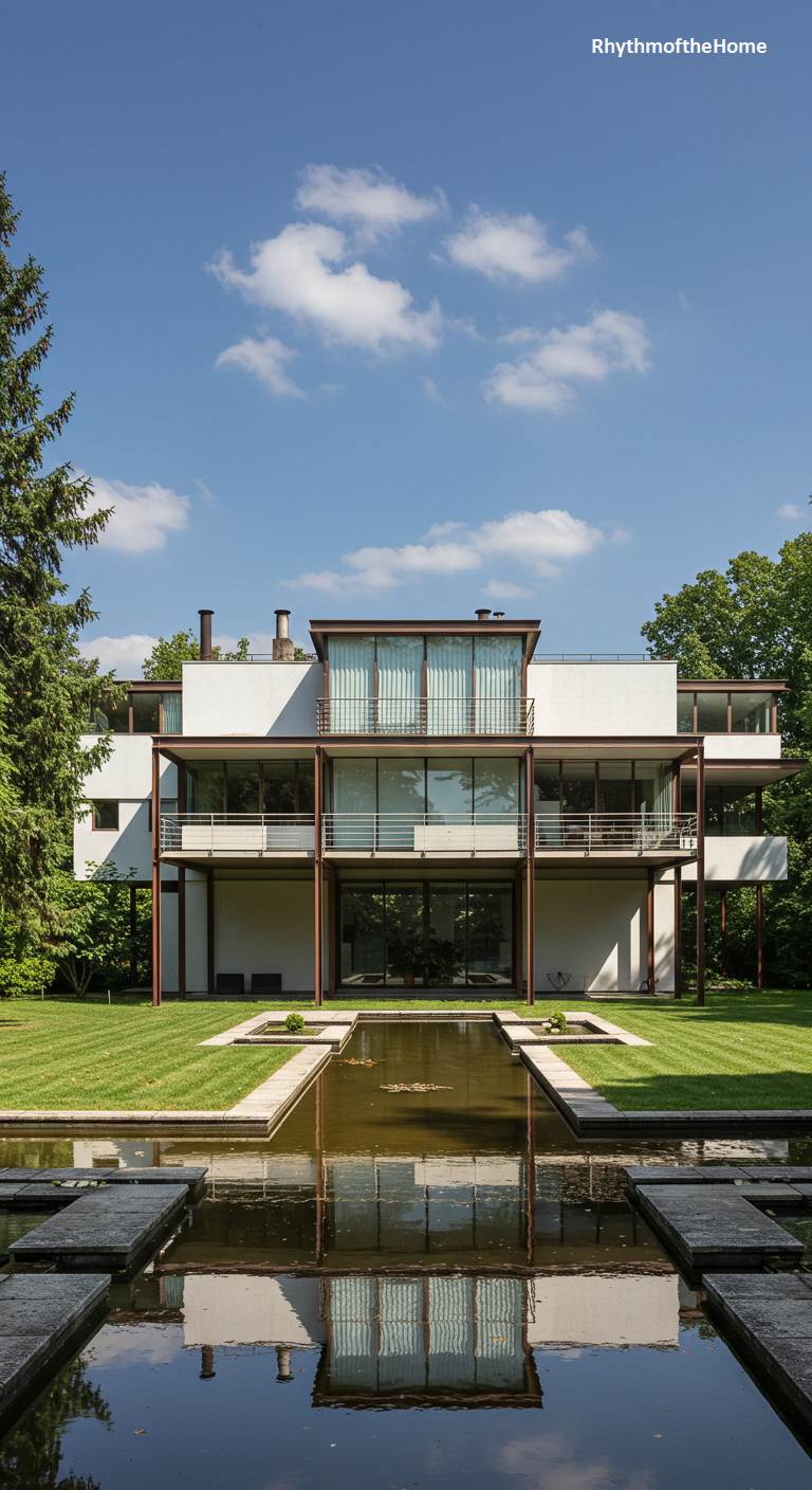 This home is a masterful study in early modernist principles, evoking the pure, functional aesthetic of the International Style. The building is a dynamic assembly of interlocking white, cubic volumes, with asymmetrical balconies and ribbon windows that emphasize horizontality. Simple pipe railings and flat roofs maintain the unadorned, form-follows-function ethos. The surrounding garden echoes this geometric rigor, featuring a square reflecting pool neatly framed by trimmed boxwood hedges. The composition of house and landscape feels deliberate and intellectual, a timeless tribute to the pioneers of modern architecture and their revolutionary vision.