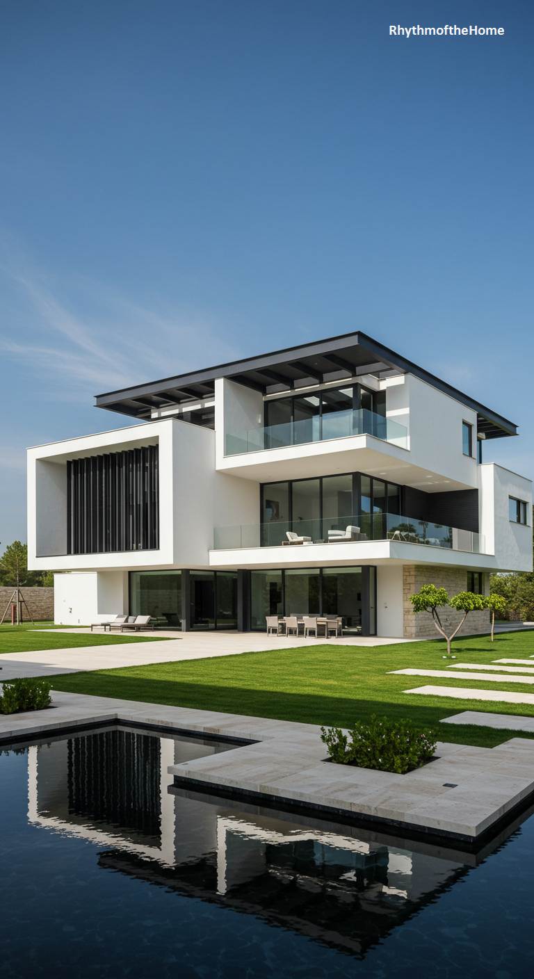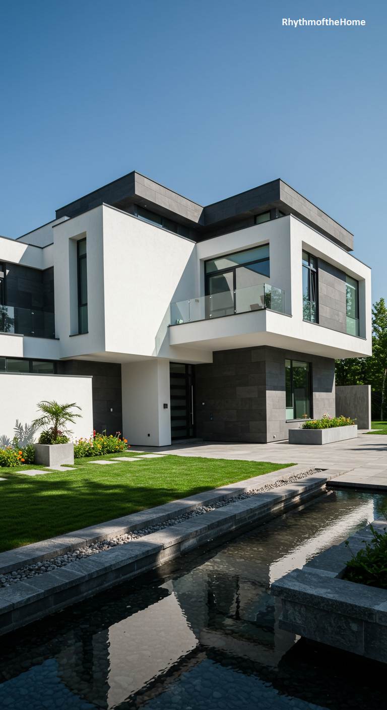 This modern home is a stunning composition of interlocking geometric volumes under a brilliant blue sky. Crisp white stucco surfaces contrast sharply with deep charcoal stone cladding, creating a dynamic visual tension. The architecture plays with solids and voids, featuring a cantilevered upper level that shelters the entrance and a sleek glass balcony that extends the living space outwards. A meticulously manicured lawn and a linear water feature in the foreground mirror the building’s clean lines, grounding the bold structure in a serene, orderly landscape. It’s a testament to minimalist luxury, where every angle and surface is deliberate and impactful.