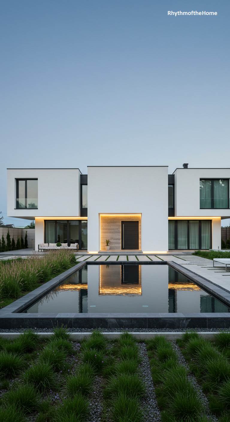 As twilight descends, this modern home transforms into a beacon of serene elegance. Its minimalist, symmetrical facade is bathed in a warm, inviting glow from recessed lighting, which traces the clean horizontal lines of the architecture. The true centerpiece is the expansive, dark reflecting pool that lies before it, capturing a perfect, shimmering mirror image of the illuminated structure. Flanked by soft ornamental grasses that sway gently in the evening air, the home exudes a sense of calm and sophisticated tranquility. It’s a masterful blend of stark modernism and atmospheric warmth, where light and water create a captivating spectacle.
