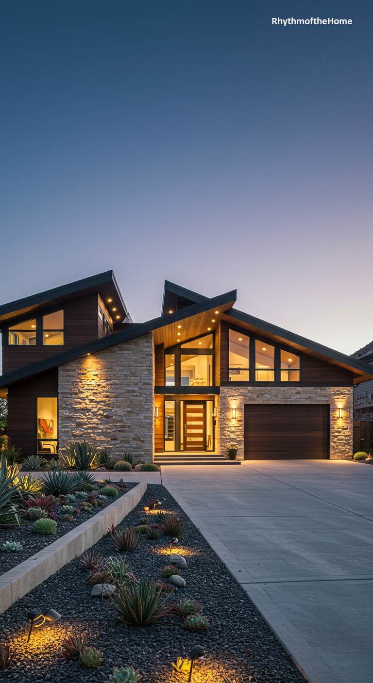 This striking modern home harmonizes natural textures with a daringly angular design. Its dynamic, multi-pitched roofline soars against the soft twilight sky, creating a powerful silhouette. Walls of warm, stacked stone are artfully illuminated, showcasing their rugged texture and providing a beautiful counterpoint to the smooth, rich wood siding. Expansive windows reveal a brightly lit, welcoming interior. The thoughtful landscaping, featuring a meticulously arranged garden of succulents and dark gravel, echoes the home’s geometric forms. This is a residence that feels both grounded in nature and thrillingly contemporary, offering a sophisticated yet organic retreat.