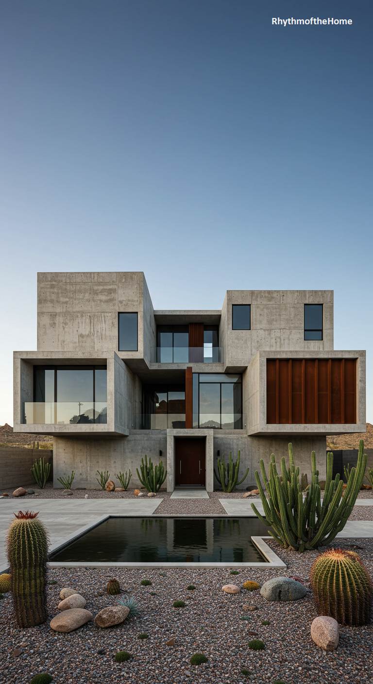 Rising from the arid desert floor like a contemporary fortress, this modern home is a masterpiece of Brutalist architecture. Its monumental form is composed of raw, board-formed concrete, showcasing the texture and imperfections of the material. The stark grey is punctuated by panels of weathered Corten steel, which add a warm, rusted patina, and large expanses of glass that create deep, shaded voids. Surrounded by native cacti and a bed of gravel, the structure feels intrinsically connected to its harsh yet beautiful environment. A still, dark pool at its base offers a single, stark reflection, a liquid oasis against the solid, unyielding concrete.