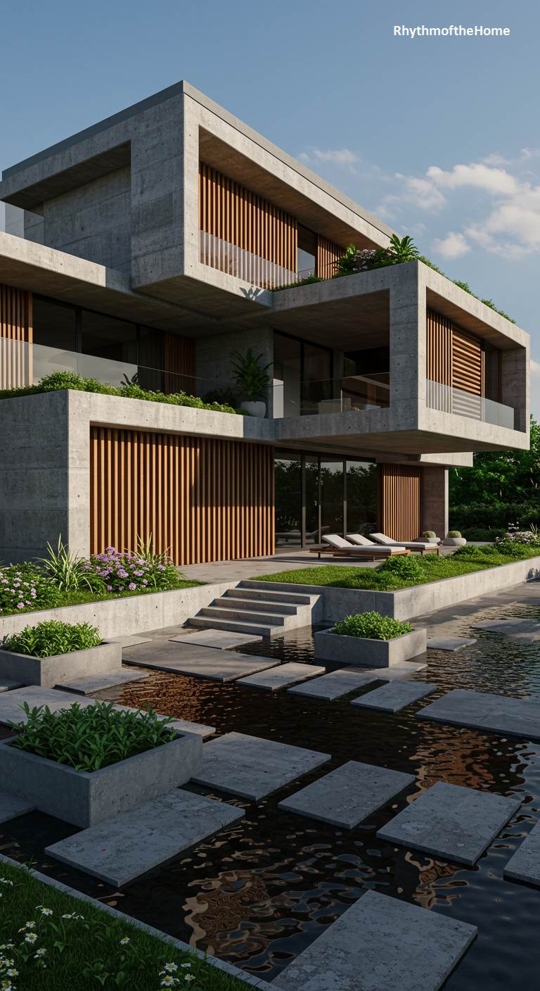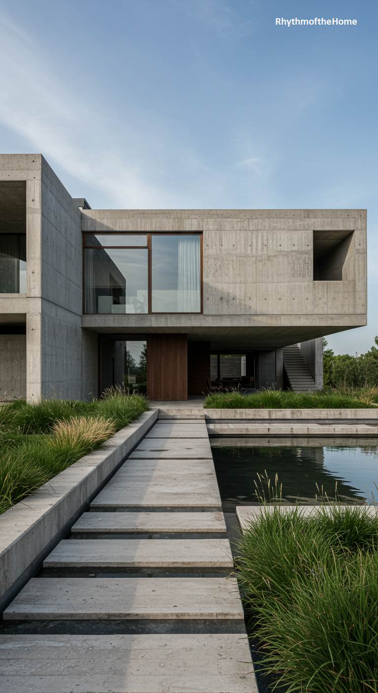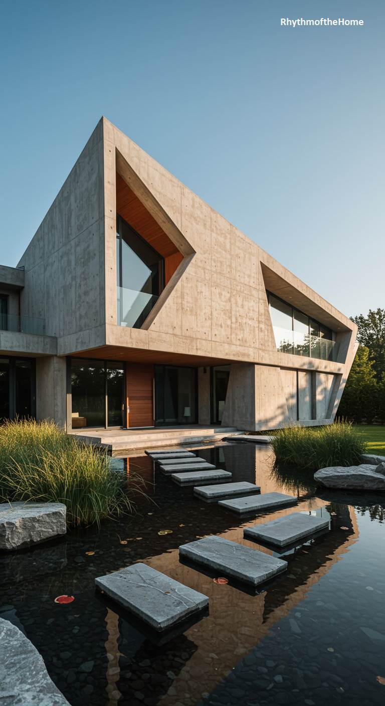 This striking modern home is a fortress of raw, board-formed concrete, its monolithic form defined by bold, angular lines and dramatic geometric cutouts. Warm wood panels nestle within the window recesses, offering a soft, organic counterpoint to the structure’s austere facade. A tranquil, dark-water pond laps at its foundation, its surface reflecting the clear blue sky. A path of floating stone slabs invites a meditative journey across the water to the entrance, while clumps of wild grasses soften the edges, creating a powerful yet serene dialogue between the commanding architecture and its natural, watery setting.
