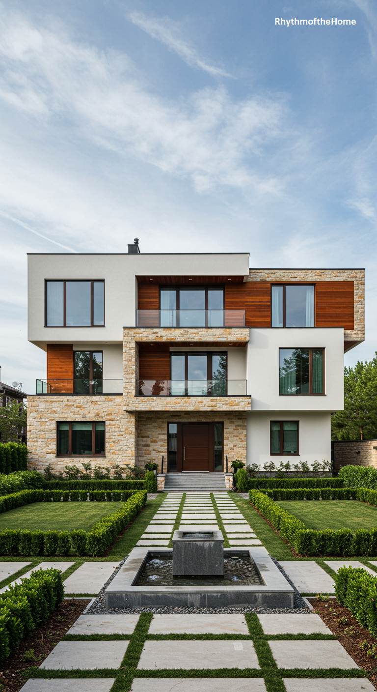 Emanating an air of structured elegance, this grand modern home presents a masterclass in balanced composition and material harmony. Crisp white stucco planes intersect with warm wood siding and textured, light-stone walls, creating a visually rich and layered facade across its multiple levels. Glass-railed balconies offer expansive views, while large windows promise light-filled interiors. The approach is a study in formal symmetry, with a central stone pathway flanked by perfectly manicured boxwood hedges, leading the eye past a gentle, bubbling fountain to the welcoming, oversized wooden entryway under a softly clouded sky.