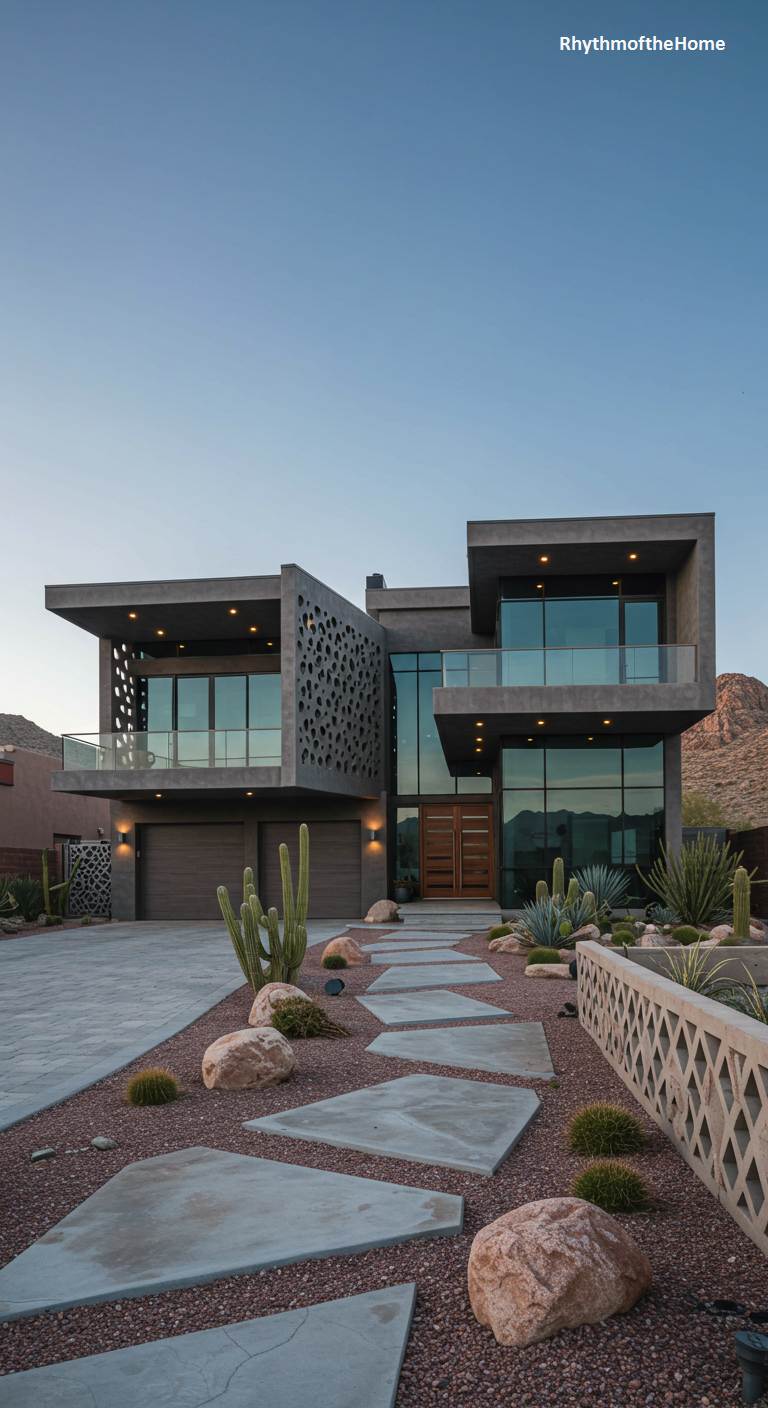 Nestled into a dramatic desert landscape at twilight, this modern home is a composition of intersecting gray volumes and transparent glass. Its most captivating feature is an intricate, laser-cut screen that casts a veil of artistic shadow, contrasting its organic, floral-like pattern against the building’s crisp geometry. The xeriscaped garden embraces its arid environment, with sculptural cacti and rugged boulders scattered amongst reddish gravel. An informal path of geometric pavers guides visitors through the drought-tolerant flora, creating a seamless fusion of contemporary design and the raw beauty of the surrounding mountain terrain.