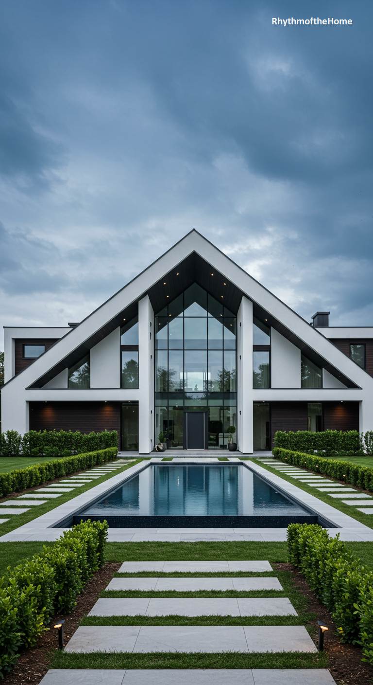 This stunning modern home reimagines the classic A-frame silhouette with breathtaking scale and dramatic flair. Its soaring, sharply-peaked roofline frames a monumental glass facade that erases the boundary between the grand interior and the moody, cloud-filled sky above. A pristine reflecting pool acts as a liquid threshold, its still, dark surface mirroring the home’s powerful symmetry and guiding the eye along a clean, minimalist path toward the central entrance. Crisp white planes contrast with dark wood accents, while neatly trimmed hedges provide a green, orderly frame for this awe-inspiring architectural statement.