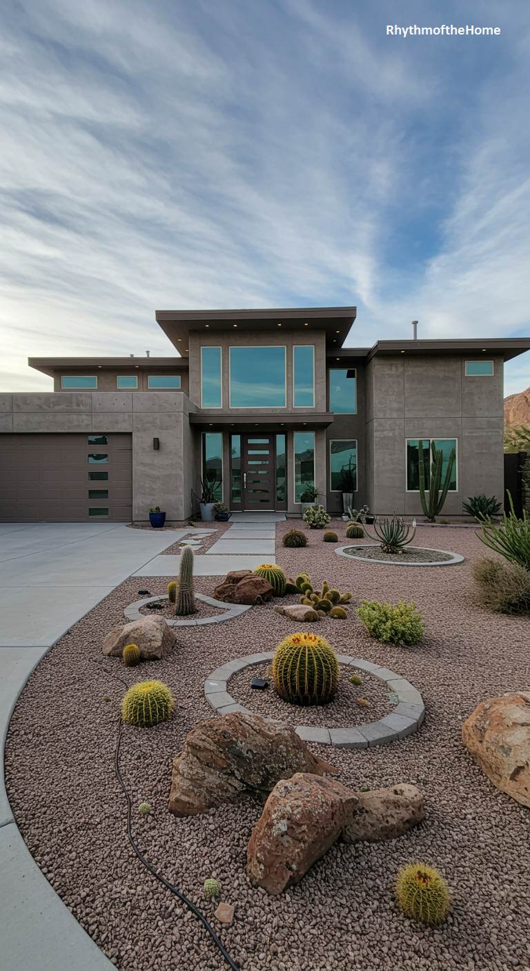 Embracing its arid surroundings, this striking modern home rises from the desert floor like a natural rock formation. Its monolithic, earth-toned stucco facade is punctuated by large geometric windows that reflect the vast, cloud-streaked sky. Instead of a traditional lawn, a thoughtfully designed xeriscape garden thrives, with sculptural cacti and barrel succulents nestled among decorative gravel and boulders. The landscaping creates circular patterns that soften the home’s sharp angles, grounding the structure in its environment. This is a dwelling that celebrates its location, offering a bold yet harmonious fusion of contemporary architecture and the rugged beauty of the desert.