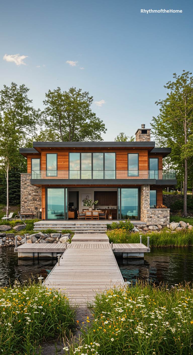 This modern home rests in perfect harmony with its tranquil lakeside setting. Its clean, horizontal lines are softened by natural materials; warm wood siding complements the rugged texture of stacked stone, while expansive glass walls dissolve the boundary between the cozy interior and the calm water. A simple wooden dock extends like an open invitation, bridging the manicured landscape with the lake’s gentle currents. Framed by wildflowers and mature trees, the residence feels less like an imposition on the landscape and more like a quiet, elegant vantage point from which to soak in the surrounding peace.