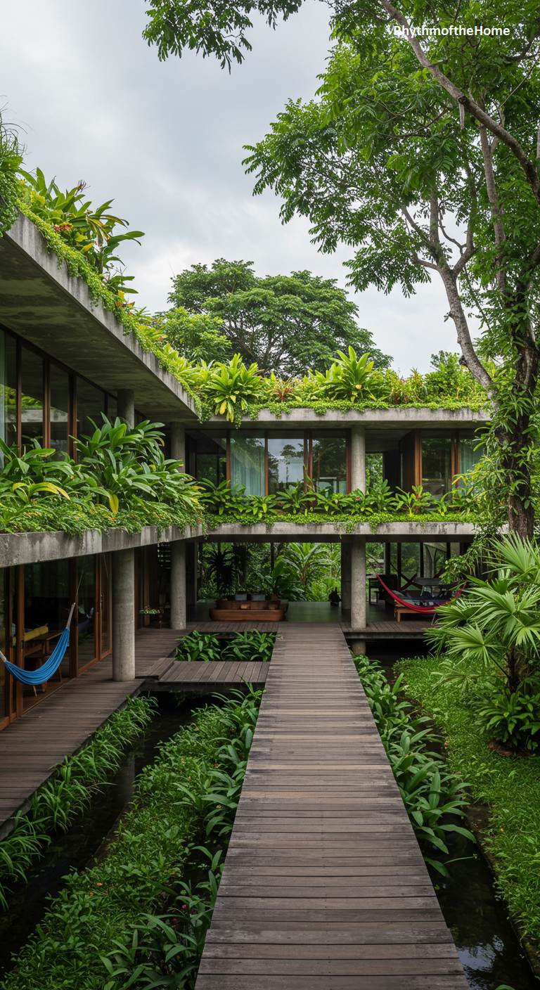 This is not a house in a jungle, but a modern home as a jungle. Raw concrete forms a multi-level skeleton, a brutalist framework that serves as a trellis for an explosion of life. Cascading greenery spills from every edge, turning flat roofs into lush canopies and balconies into verdant gardens. Wooden walkways meander over narrow water channels, guiding you through a space where the air is thick with the scent of damp earth and foliage. With hammocks strung in open-air corridors, this architectural wonder erases the distinction between inside and out, offering a complete and breathtaking immersion in nature.