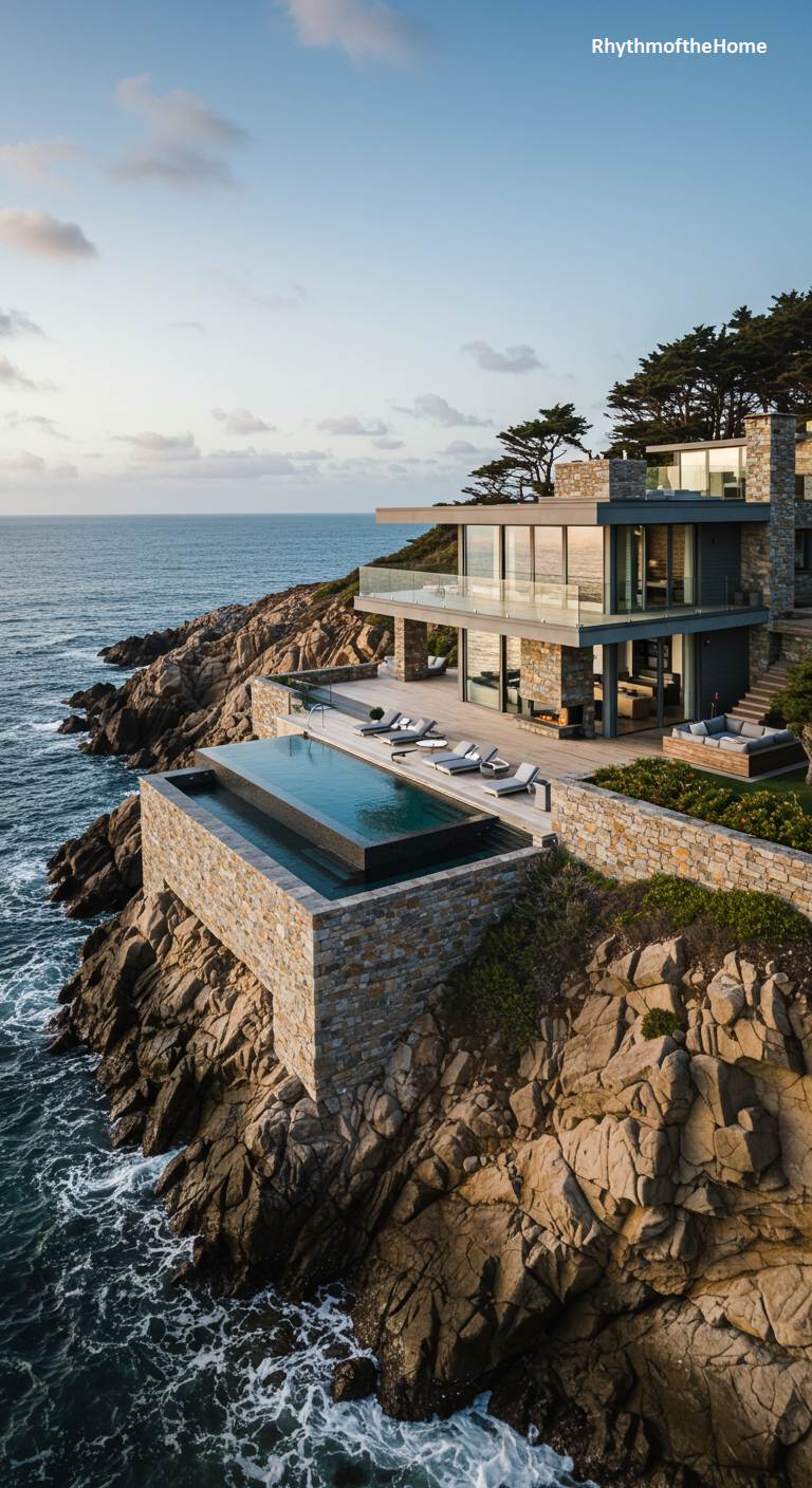 Carved into a dramatic, rocky precipice, this modern home is a testament to audacious design. Its sharp, geometric form of glass, steel, and stone stands in stark contrast to the wild, untamed ocean below. Cantilevered terraces and floor-to-ceiling windows are not mere features but a means of dissolving the structure into the vast coastal panorama. The stunning infinity pool, encased in stone, appears to merge seamlessly with the horizon, creating a serene, liquid viewpoint suspended between the rugged earth and the endless sea. This is a residence built for breathtaking views and a profound connection to the raw power of nature.