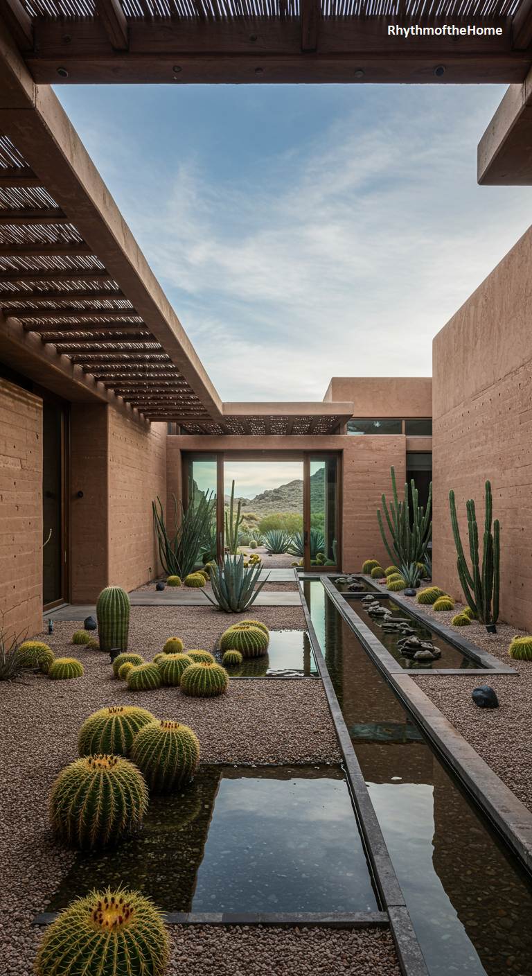 Rising from the desert floor like a natural formation, this modern home is a masterpiece of texture and light. Its terracotta-hued rammed-earth walls provide a cool refuge from the sun, enclosing a tranquil courtyard garden. Here, a minimalist aesthetic prevails; sculptural cacti and golden barrel clusters are thoughtfully arranged around a slender water channel that brings the sound and coolness of water into the arid landscape. Overhead pergolas cast intricate, shifting shadows across the gravel ground, while a large, open doorway perfectly frames the distant mountains, connecting the sheltered, meditative space to the vast, open desert beyond.