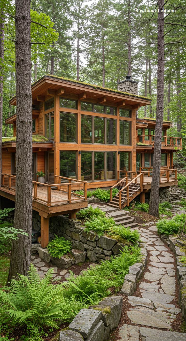Nestled amongst towering pines, this woodland modern home feels like a sophisticated treehouse for grown-ups. The structure, a warm composition of wood, stone, and glass, rises organically from a foundation of mossy rocks, its multiple levels reaching into the forest canopy. Extensive decks and balconies offer intimate perches for observing the surrounding wilderness, making the trees themselves part of the home’s architecture. A living green roof further dissolves the building into its environment, while a winding flagstone path through lush ferns creates a magical, enchanting approach to this secluded and peaceful forest retreat.