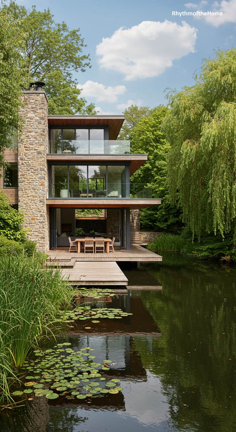 Poised at the edge of a tranquil pond, this modern home dissolves the boundary between architecture and nature. Cantilevered levels of warm wood and glass seem to float above the water, anchored by a formidable stacked stone chimney. Each floor opens onto a spacious balcony, culminating in a sprawling wooden deck that extends over the pond, inviting residents to dine amidst the rustling reeds and the gentle sway of a weeping willow. The home’s reflection shimmers on the water’s surface, a mirror image of a structure in perfect, peaceful harmony with its lush, verdant surroundings.