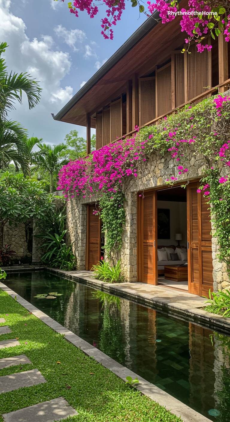 This modern home is a secluded sanctuary where rugged nature meets refined design. Walls of rough-hewn stone provide a dramatic, earthy texture, beautifully contrasted by rich, dark timber in the louvered shutters and open doorways. A brilliant cascade of fuchsia bougainvillea spills over the facade, its vibrant color a stunning accent against the natural materials. A narrow, dark water channel runs parallel to the home, its still surface reflecting the lush foliage and stone, creating a serene and private courtyard that feels like a hidden, tropical paradise, inviting a seamless flow between the cool interior and the vibrant garden.