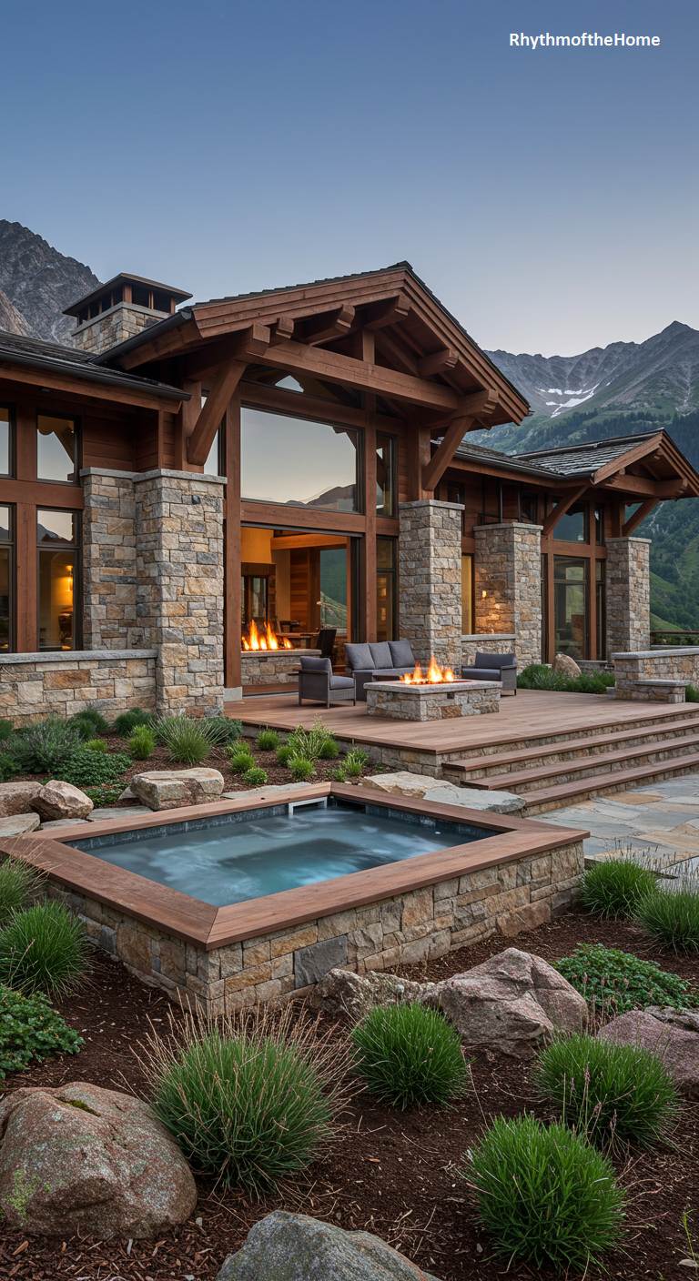 Set against a breathtaking backdrop of jagged peaks, this modern home is a masterpiece of rustic elegance. The structure is defined by its massive timber beams and robust stacked stone pillars, creating a powerful presence that complements the rugged landscape. An expansive wooden deck serves as an outdoor living room, complete with cozy seating areas warmed by glowing fire pits and a sunken hot tub for soaking under the stars. Walls of glass erase the distinction between inside and out, ensuring the awe-inspiring mountain vista is the undeniable focal point from every angle of this luxurious alpine retreat.