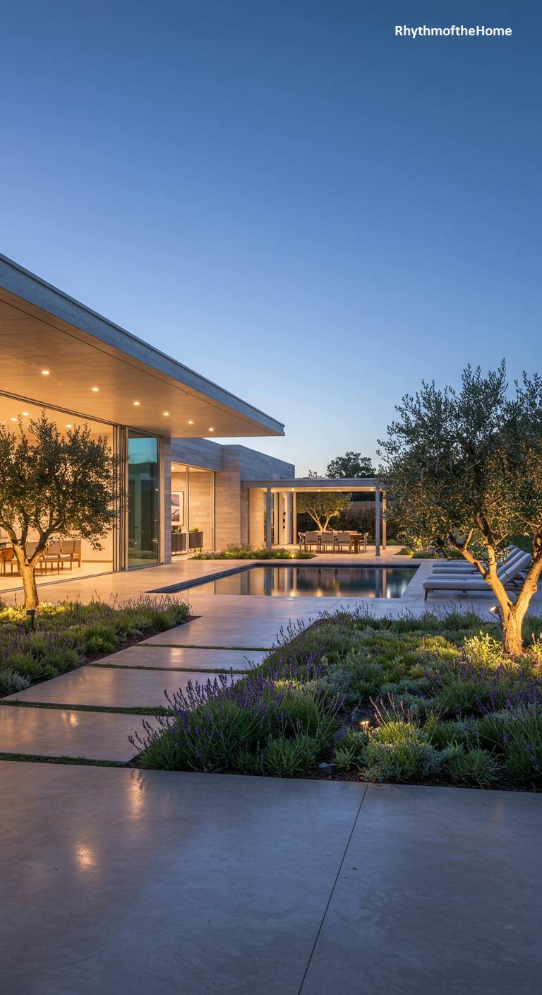 As dusk settles, this modern home transforms into a gallery of light and shadow, showcasing a masterclass in minimalist sophistication. Clean lines of smooth concrete and vast panes of glass define the structure, creating an effortless flow to the serene outdoor courtyard. Here, a sleek swimming pool mirrors the deep blue of the evening sky, flanked by carefully sculpted gardens of lavender and ancient olive trees. Strategic uplighting casts a warm, inviting glow upon the architecture and landscape, crafting an atmosphere of understated luxury and profound tranquility in a perfectly curated private oasis.