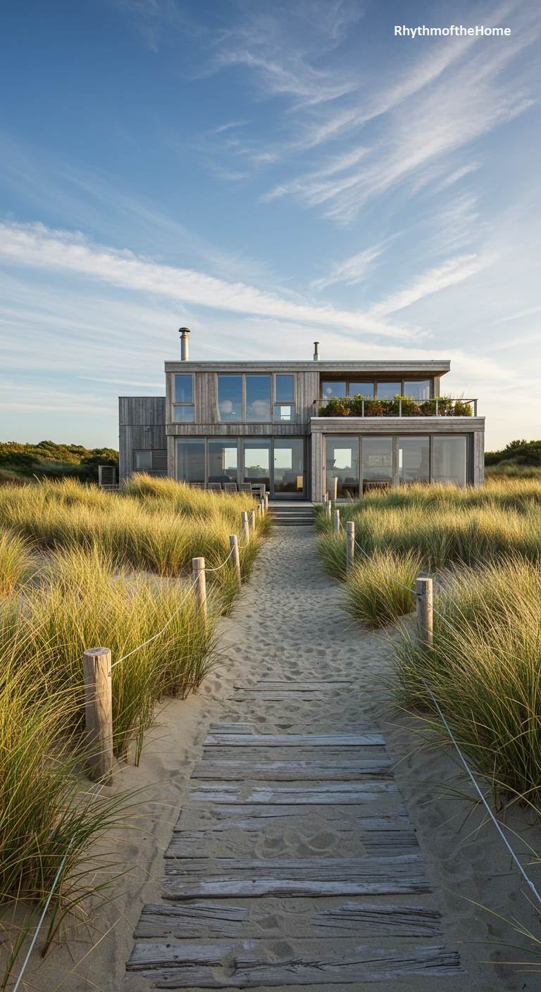 Nestled within a rolling landscape of sand dunes and windswept beach grass, this modern home stands as a quiet testament to coastal living. Clad in weathered wood that mirrors the soft, natural tones of its surroundings, the structure’s clean, geometric forms rise organically from the sand. A simple wooden plank path meanders through the golden grasses, leading the way to expansive glass windows that frame panoramic views and blur the lines between the serene interior and the wild beauty of the coast. This is not just a house, but a peaceful perch designed for observing the tides and the endless sky.