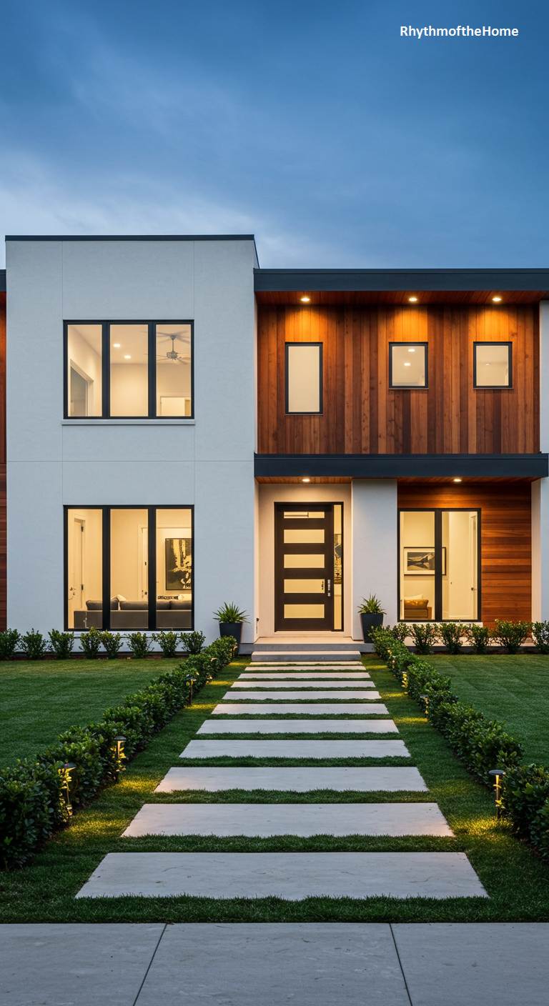 At dusk, this geometric modern home presents a study in balanced contrasts. A crisp white stucco facade stands bold against the deep blue sky, while warm wood cladding adds an organic, inviting touch to the upper level. Recessed lighting casts a gentle glow, highlighting the clean lines and creating an ambient welcome. A perfectly straight walkway, composed of floating concrete pavers set in a lush green lawn, guides the eye toward the sleek, dark front door. Illuminated low-profile shrubs line the path, adding a layer of manicured nature to this vision of sophisticated and serene contemporary living.